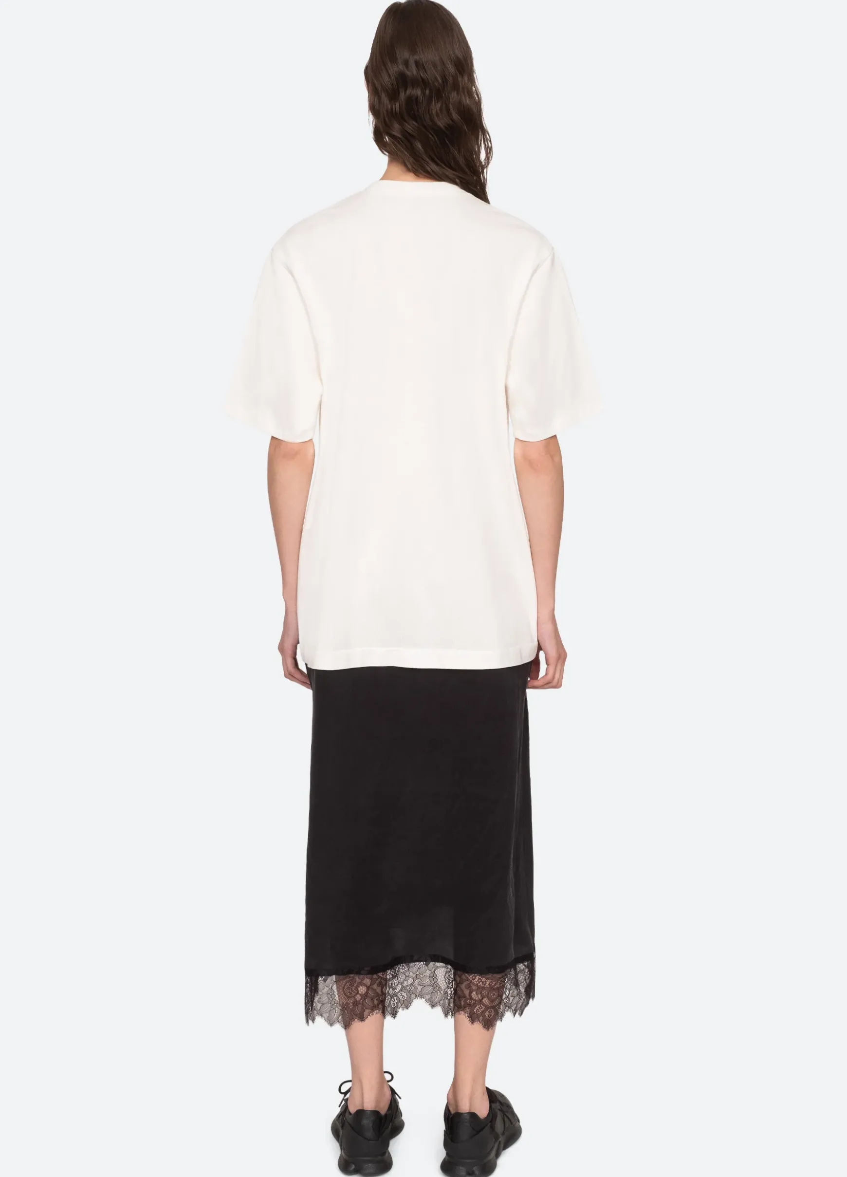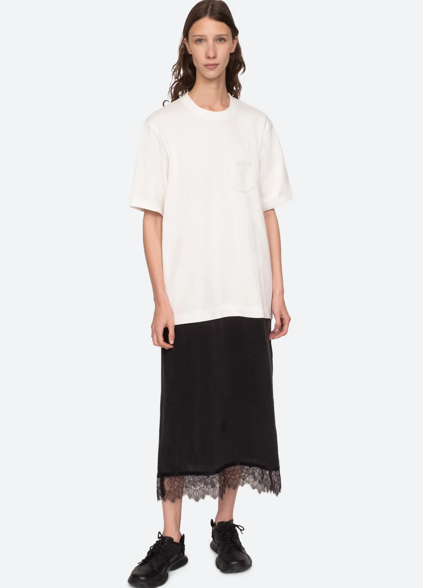 The Lorraine t-shirt dress features a combo white t-shirt top attached to a black skirt with lace hemline.