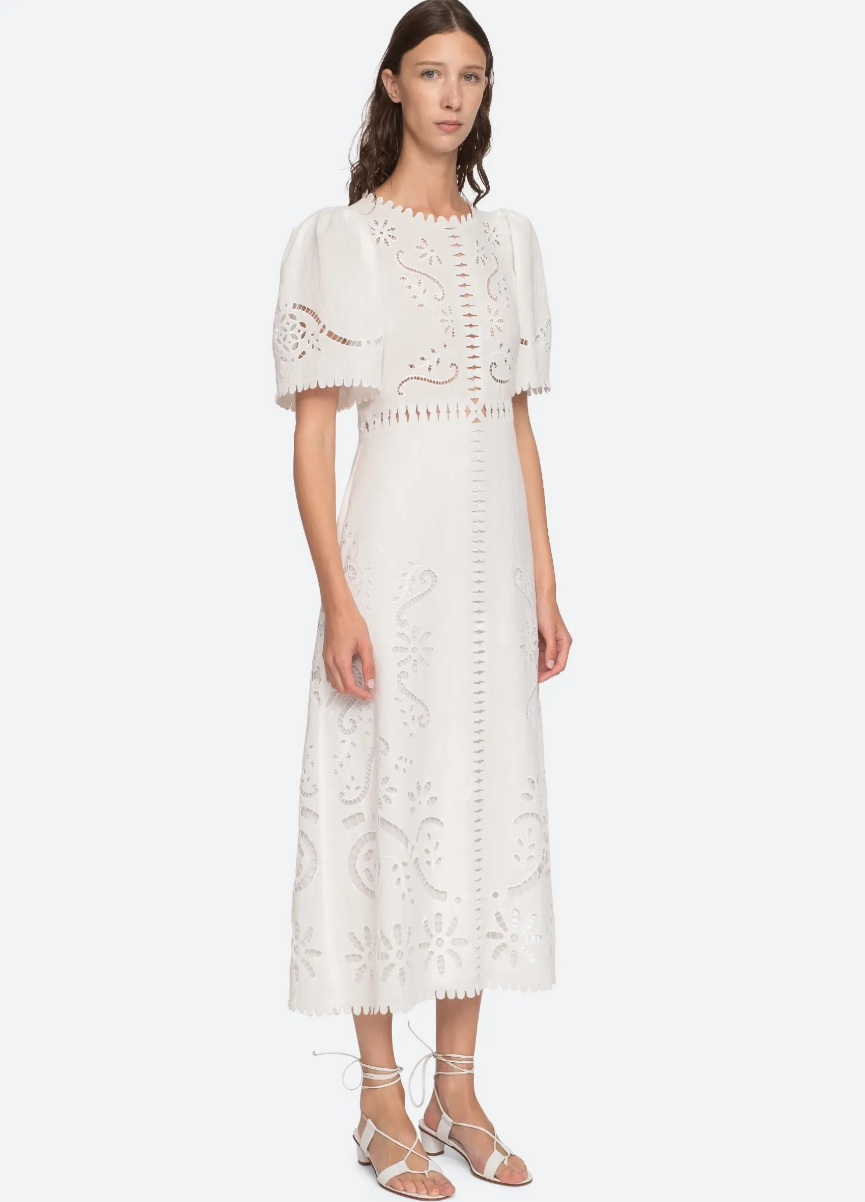 The Liat short sleeve embroidered dress features eyelet floral detailing, cutout accents and scalloped trim detailing.