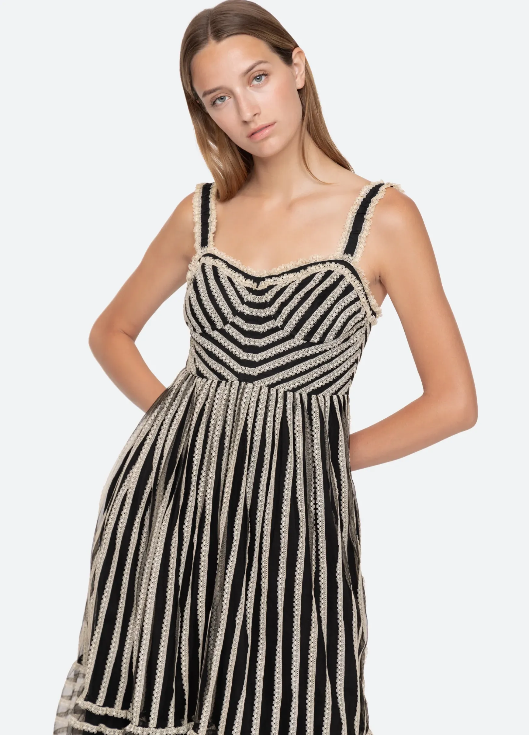 The Verona lace dress features a corset style top, ruffled straps and full skirt.