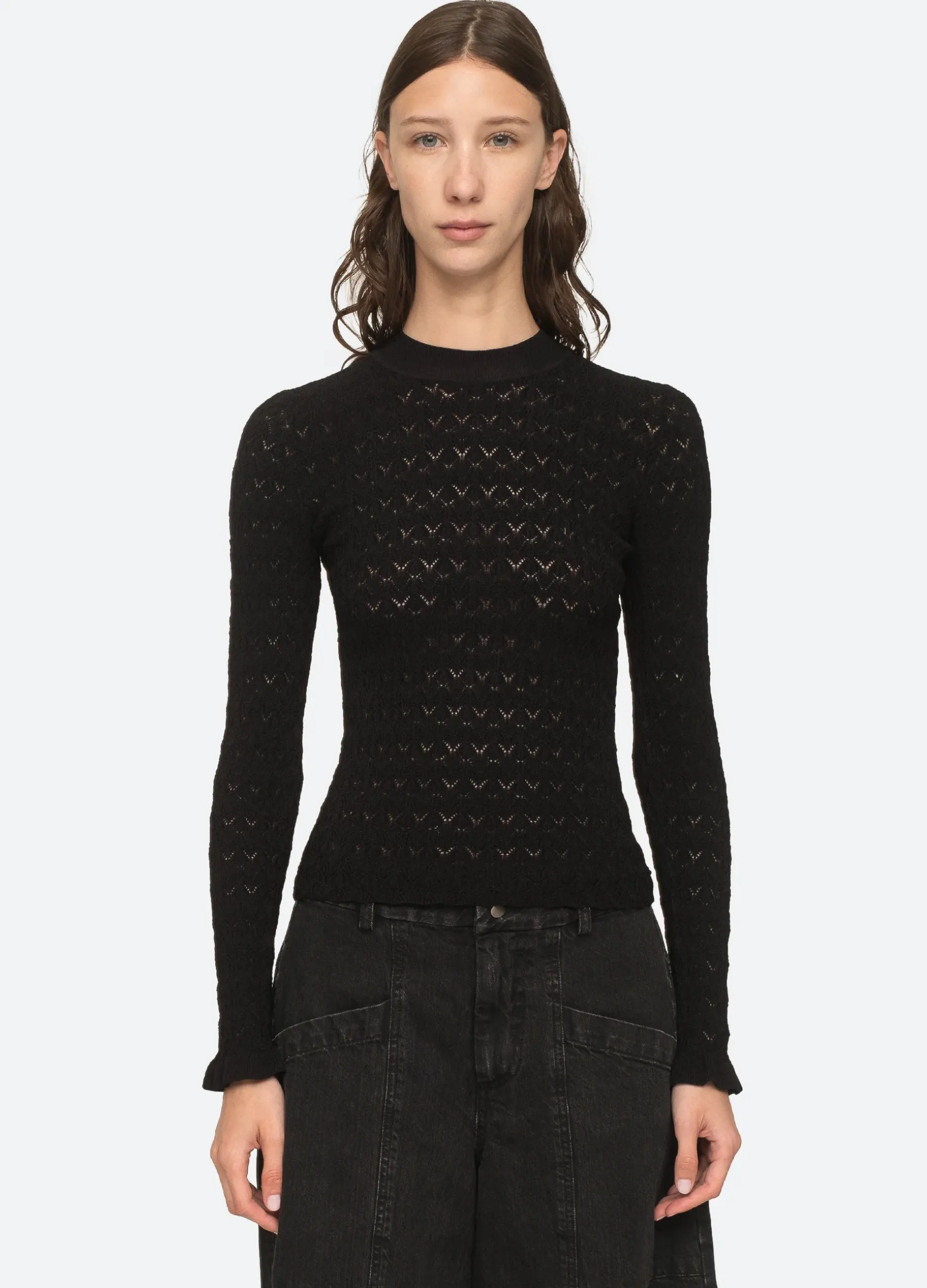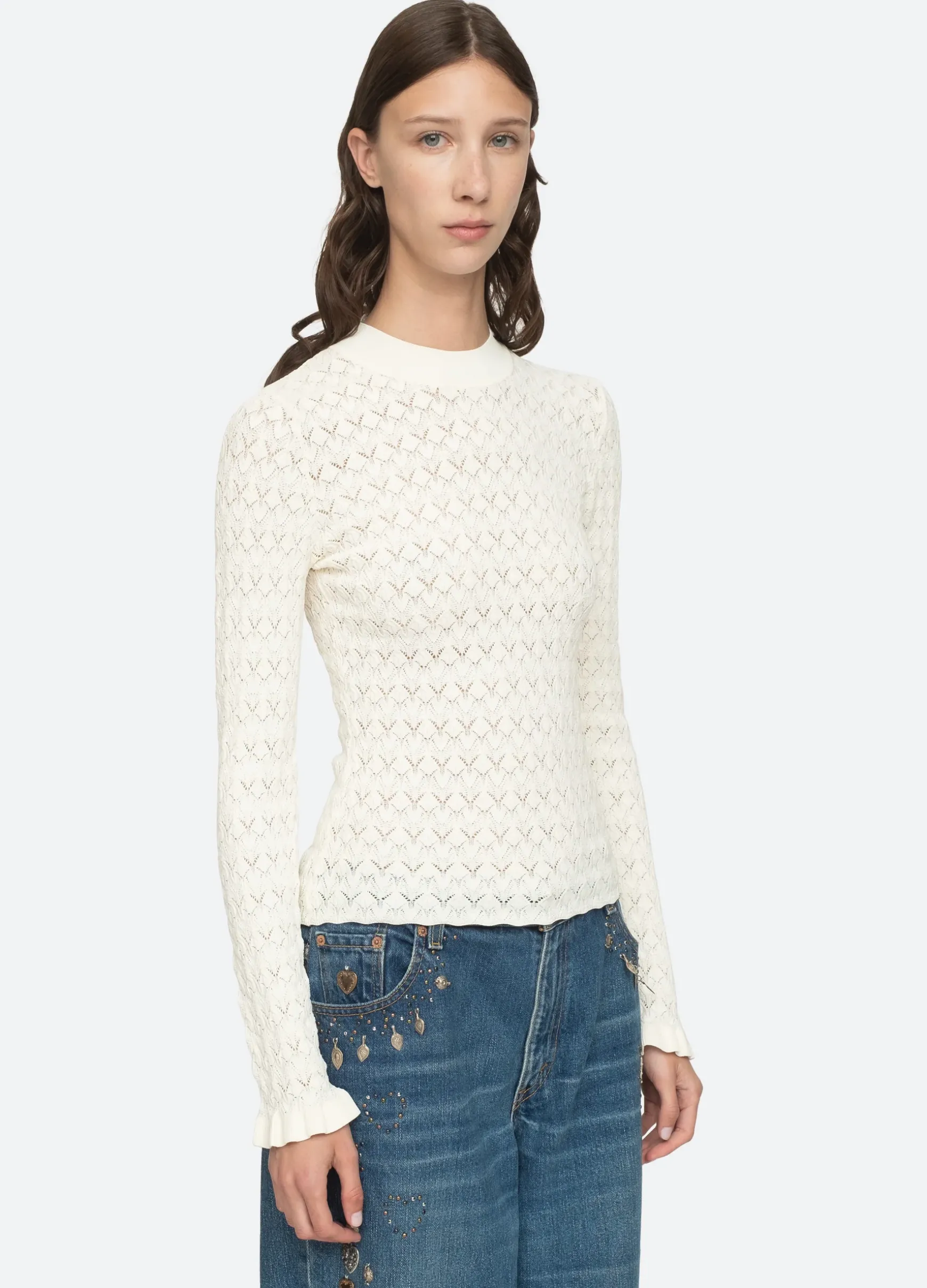 The Rue fine gauge knit sweater features ruffle cuffs and is crafted for a slim fit. The perfect layering piece.