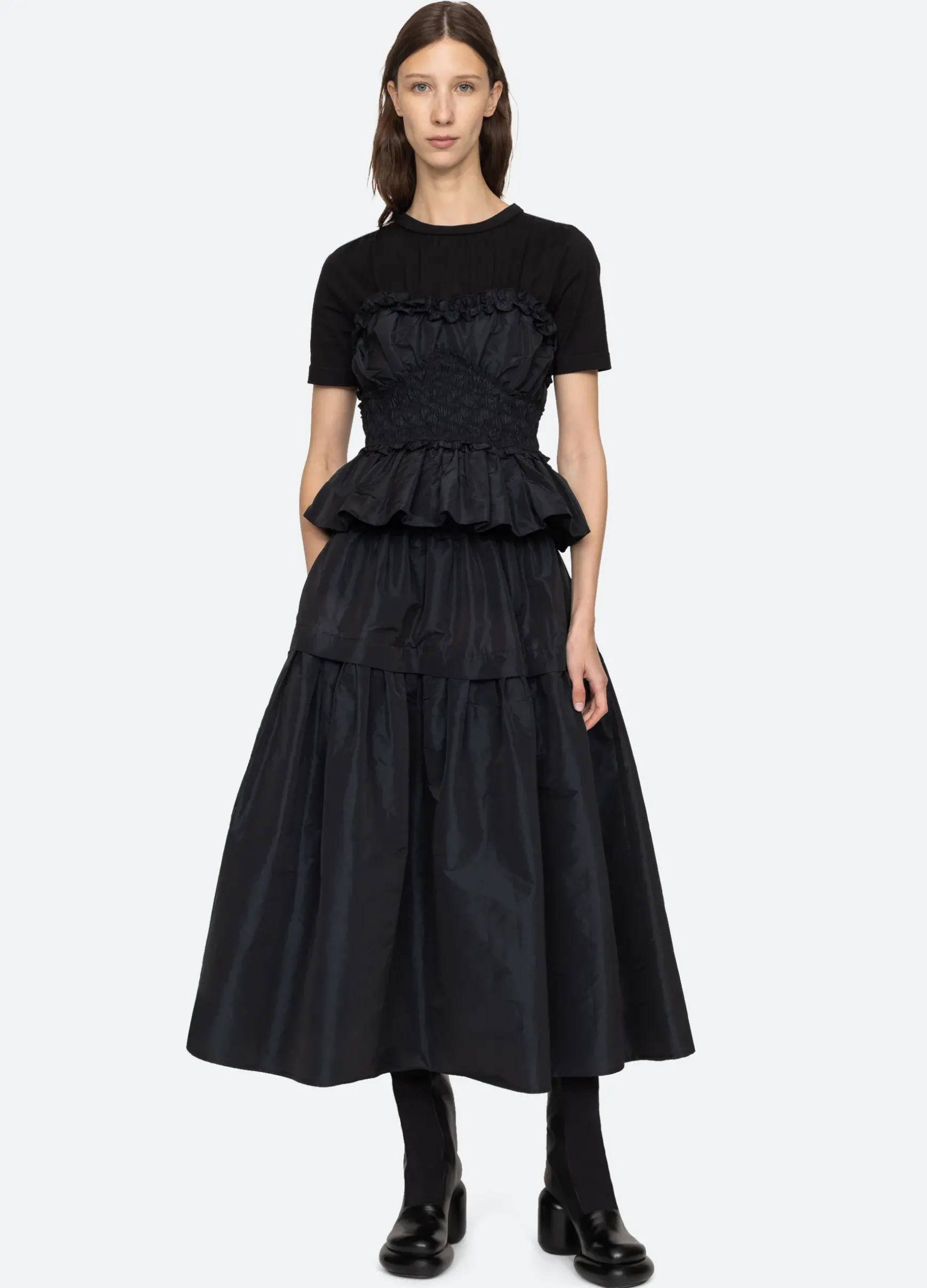 The Diana taffeta skirt features a smocked waistband and midi silhouette.