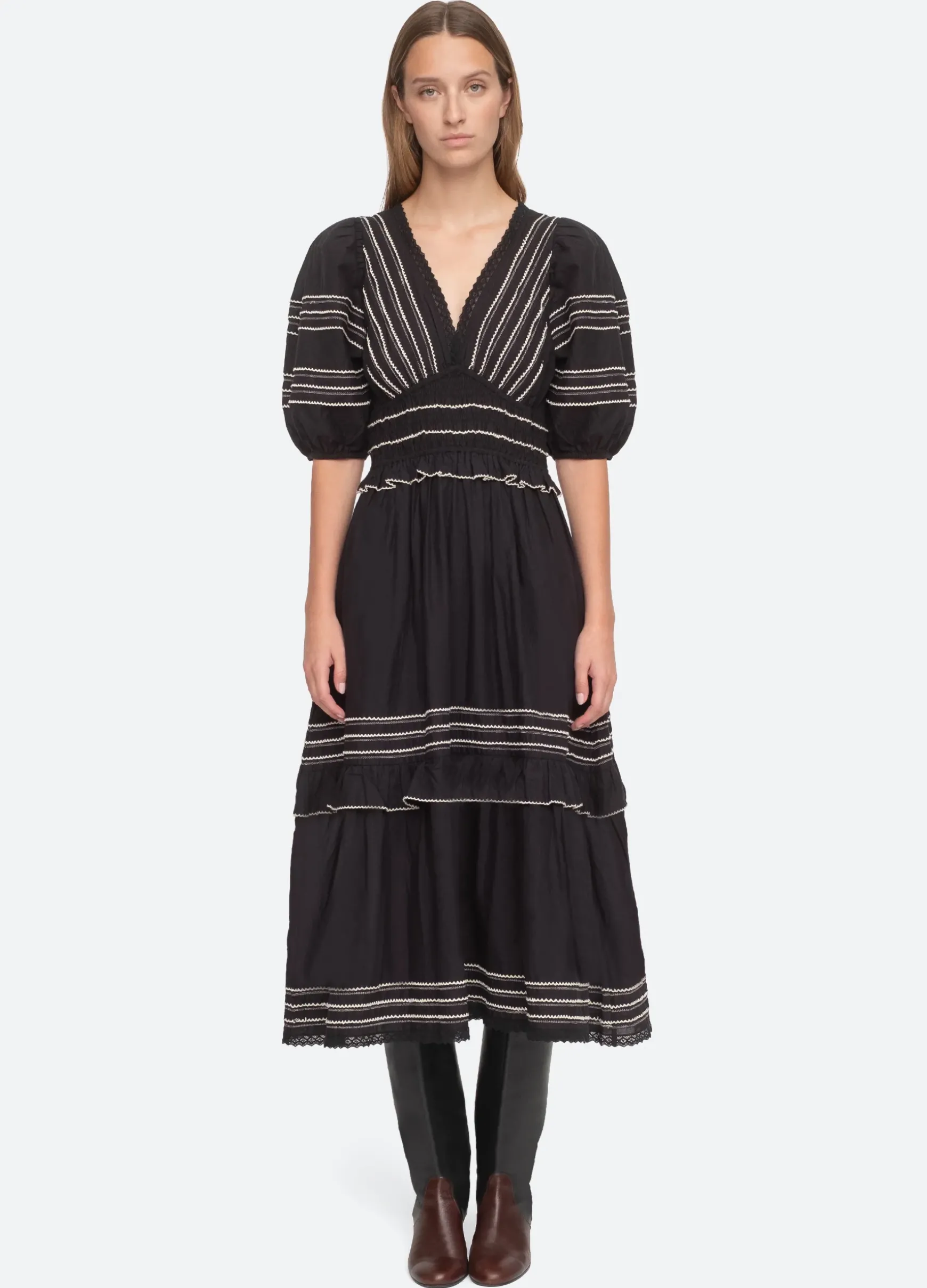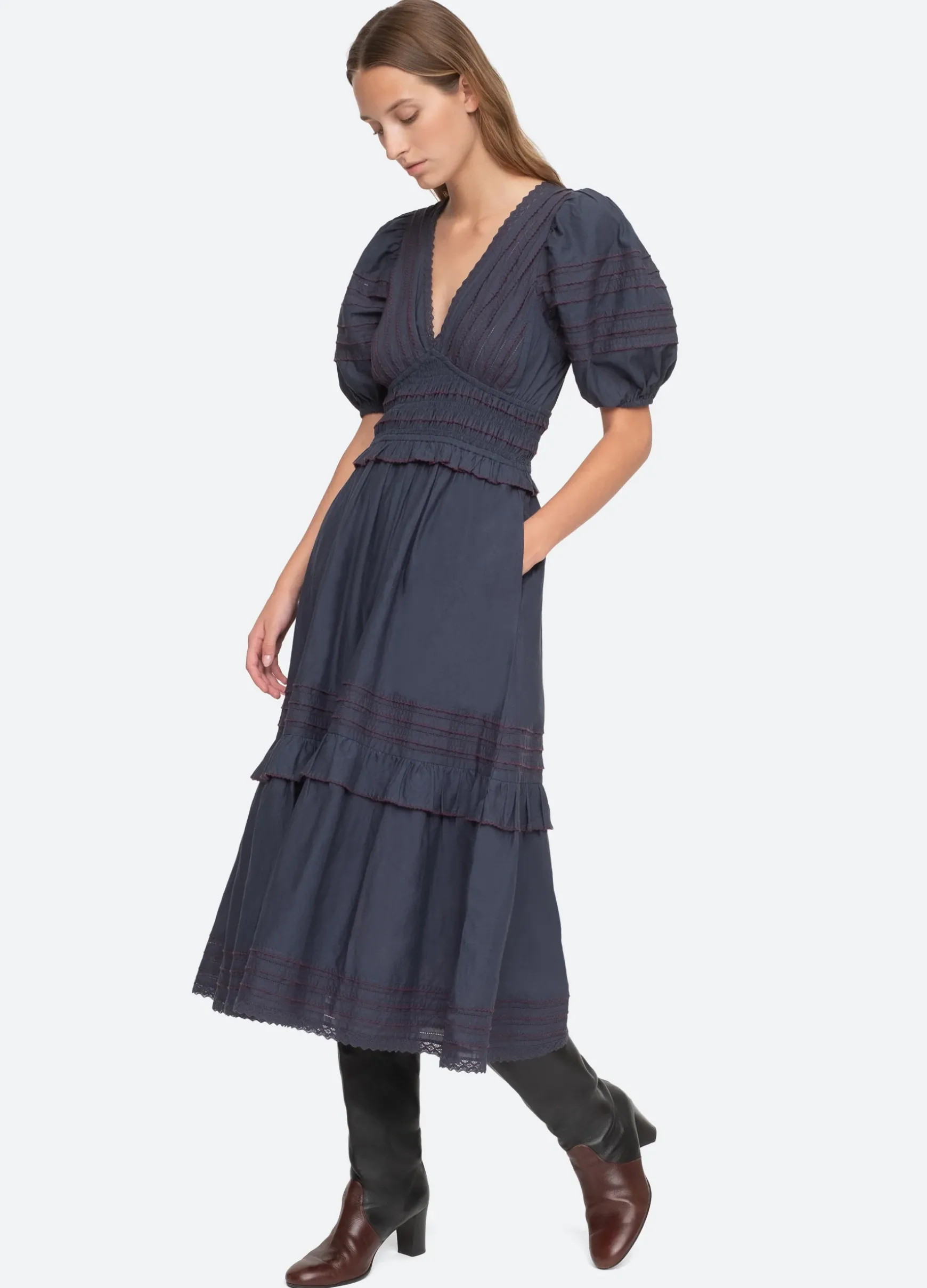 The Mable midi dress features a v-neckline, puff sleeves, pleated detailing, lace trim and smocking.