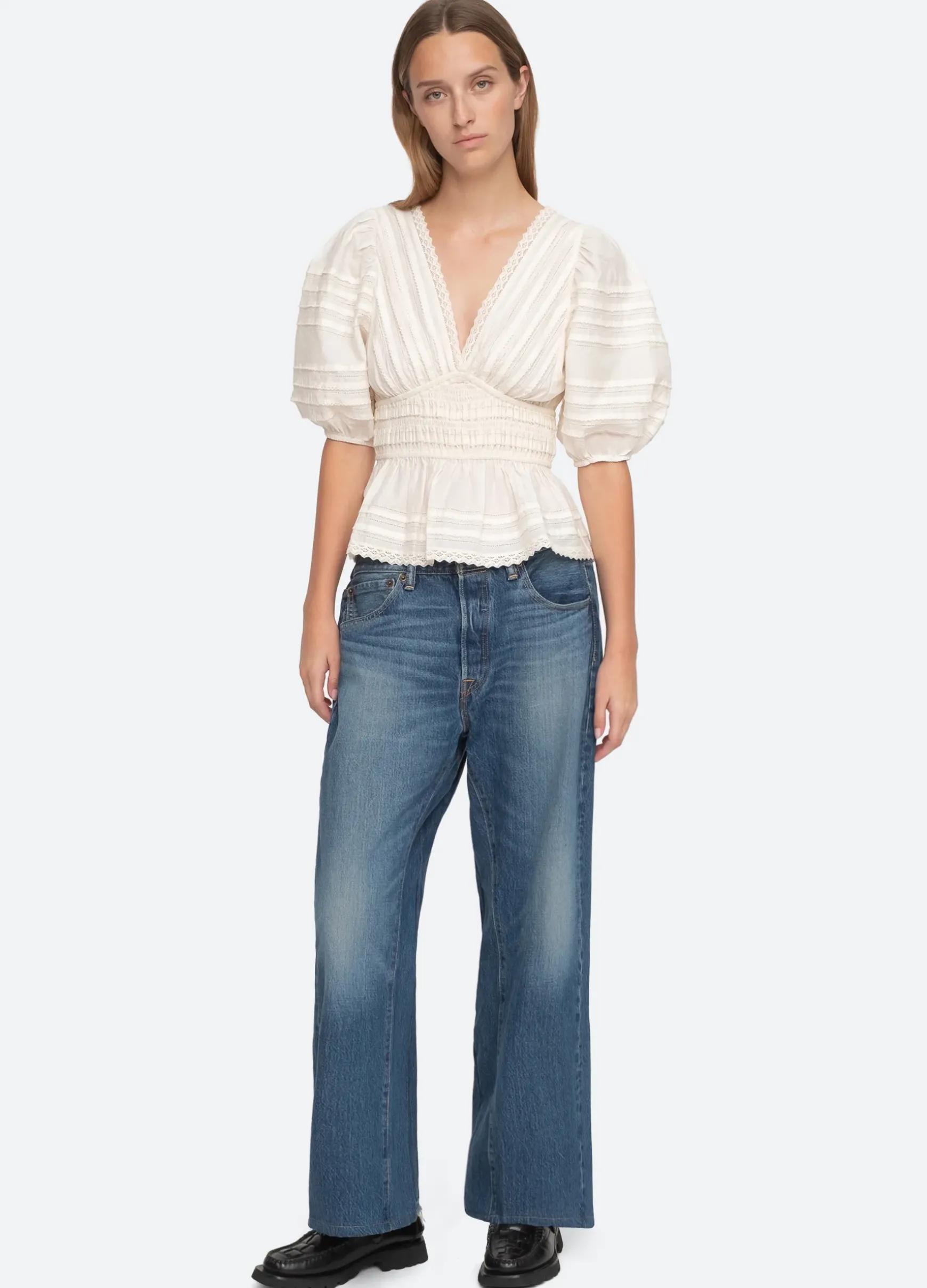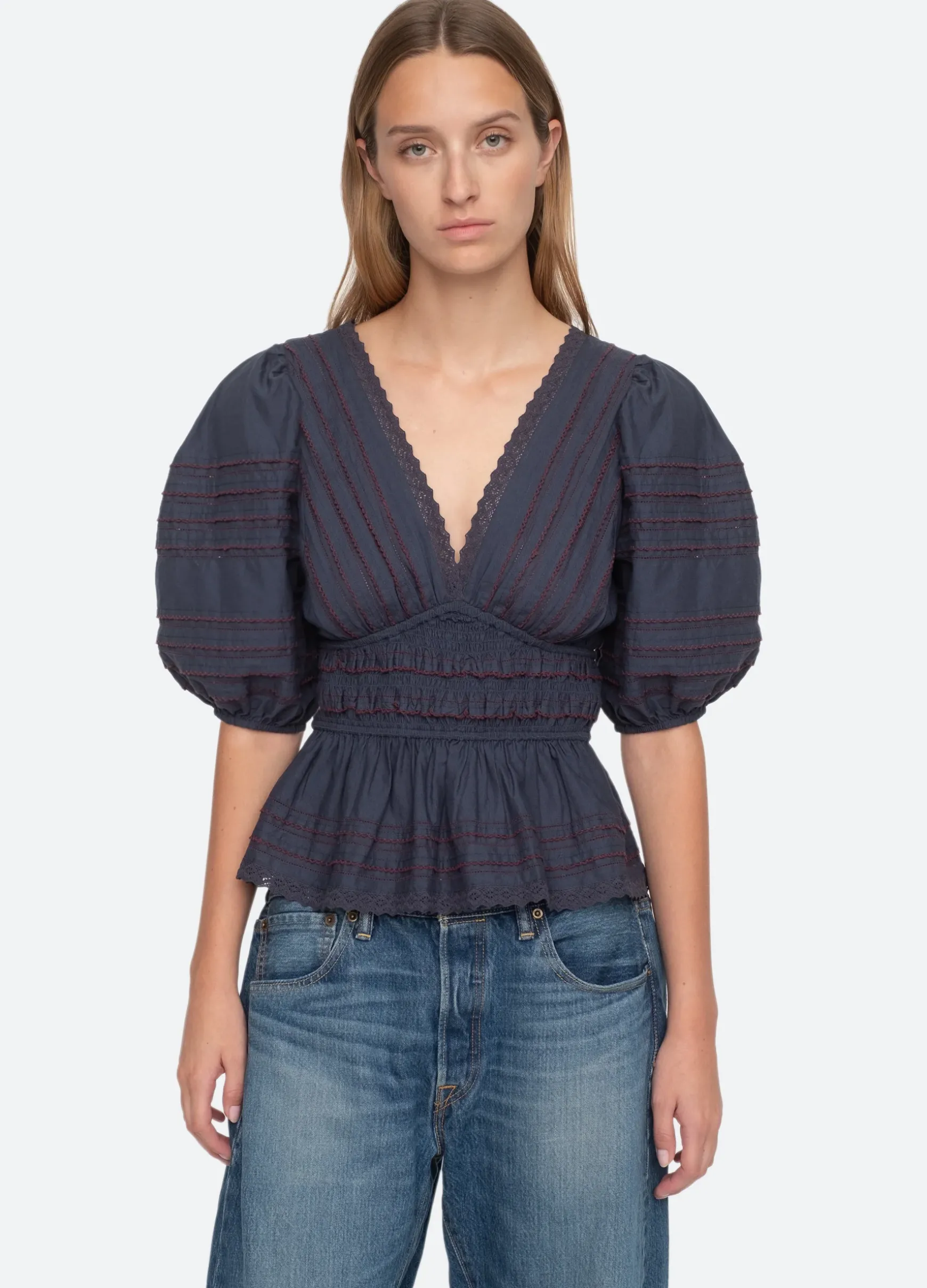 The Mable top features puff sleeves, v-neckline, pleated detailing and lace trim.
