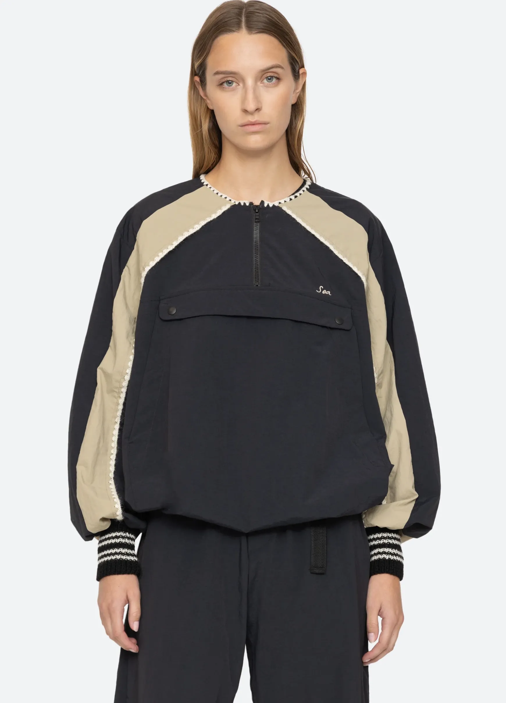 The Asta windbreaker jacket features crochet trim and embroidered ‘Sea’ logo.
