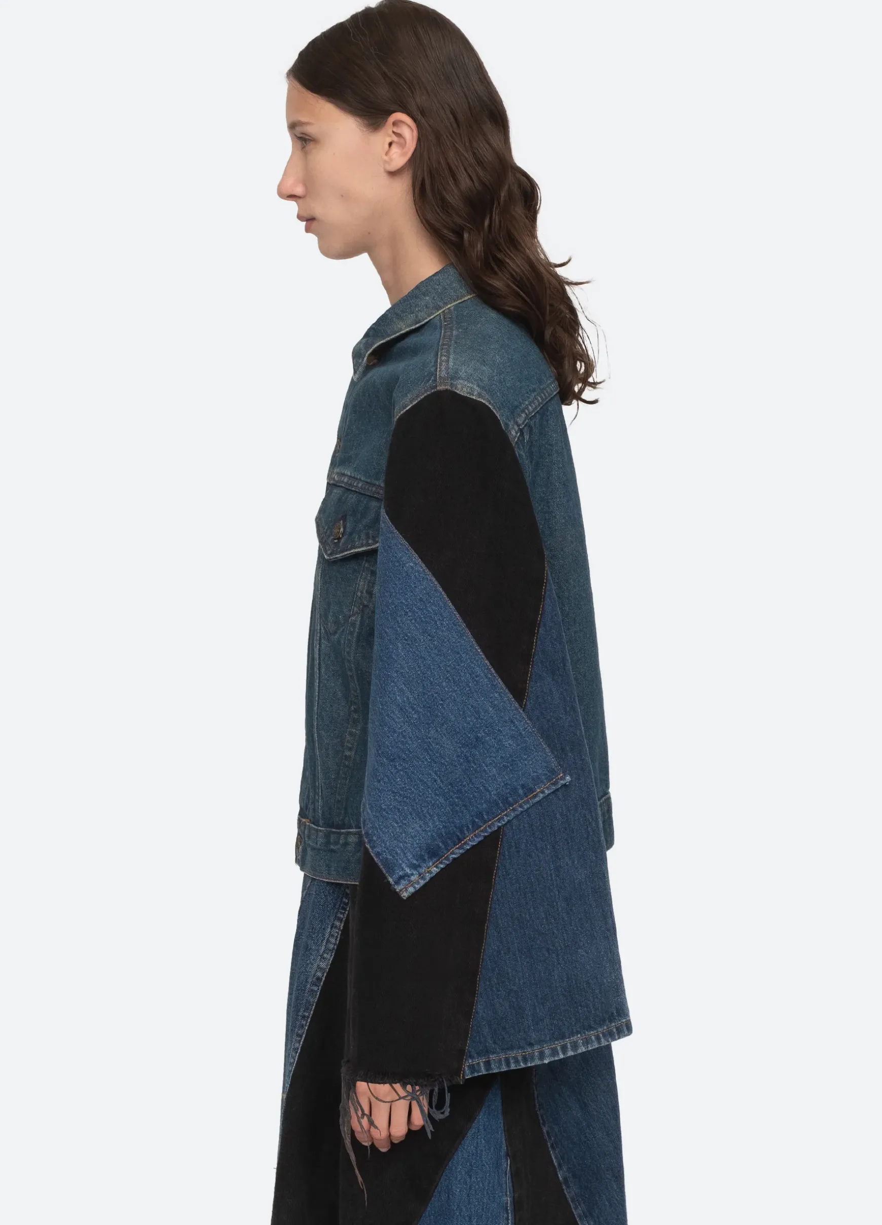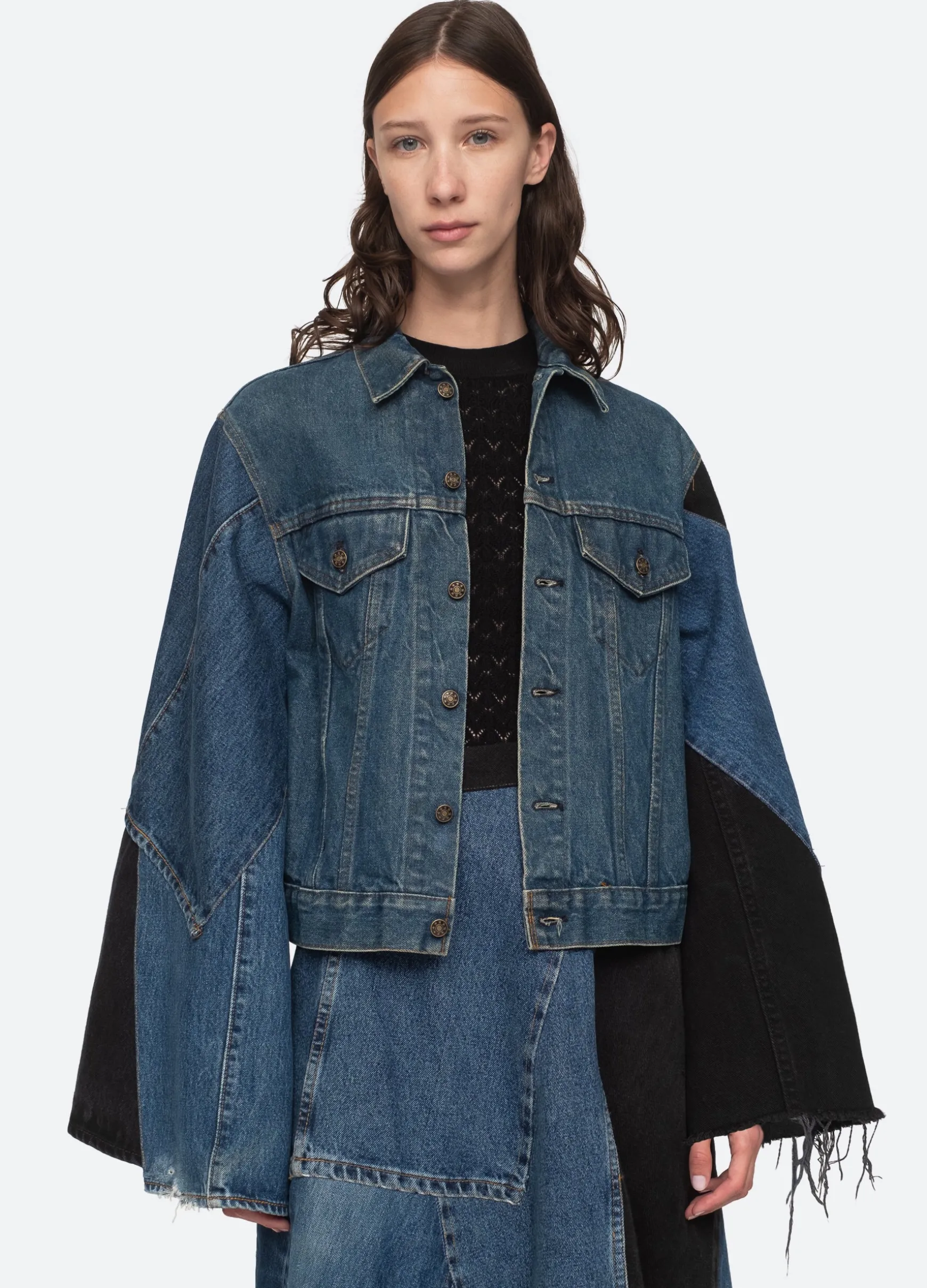 The Elena denim jacket features a variety of denim tones, deconstructed look and finished with distressed