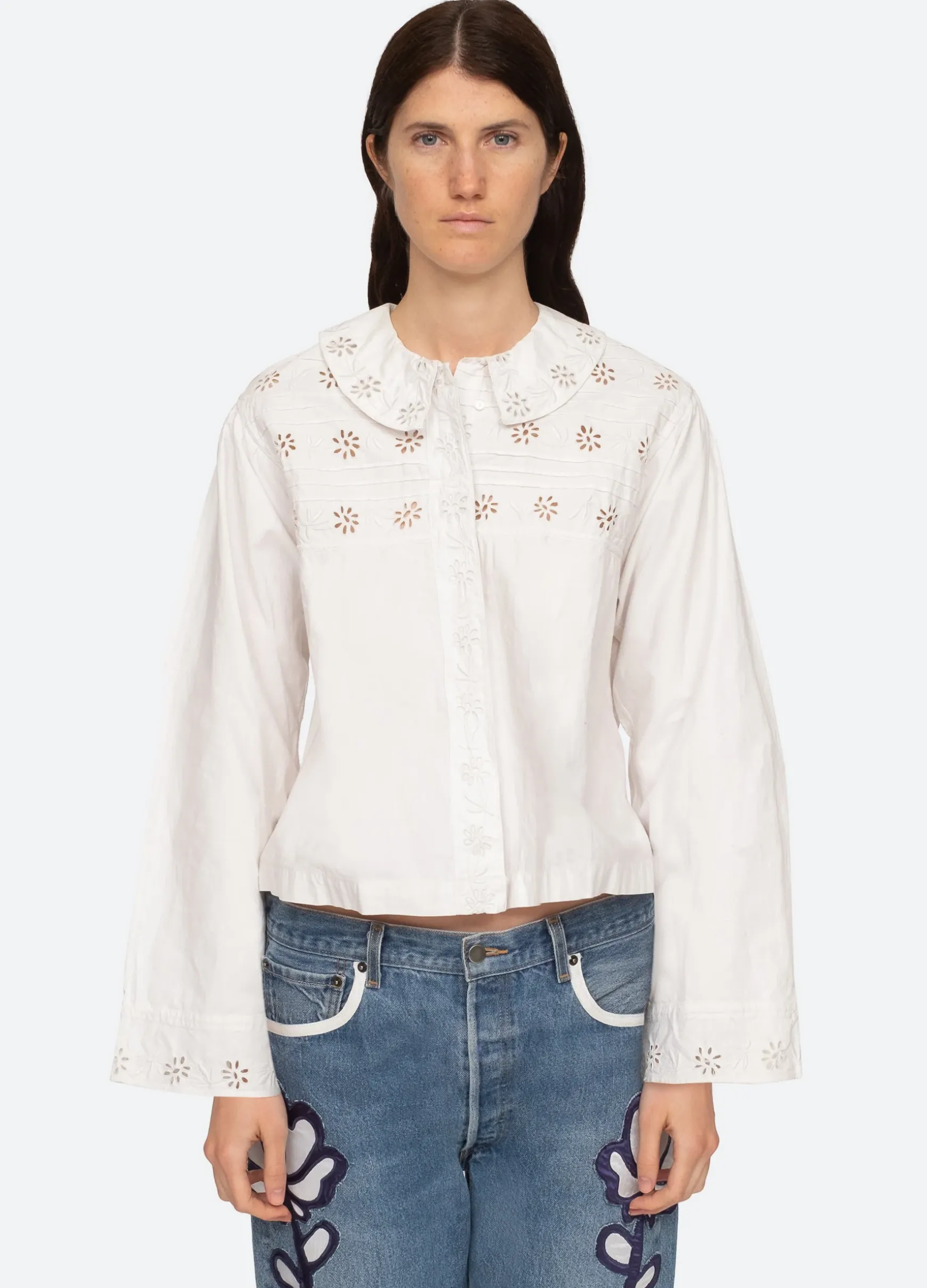 The Paloma Vintage x Sea collection was born from Monica and Ferial’s shared passion for vintage. Monica discovered Paloma Vintage on a trip to Copenhagen and immediately was drawn to the shop’s unique curation of vintage treasures. Over the years, Monica forged a friendship with Ferial which led to designing a capsule collection together inspired by Ferial’s vintage finds and unique styling sensibility. The Paloma eyelet top features eyelet trim detailing, bell sleeves and button front.