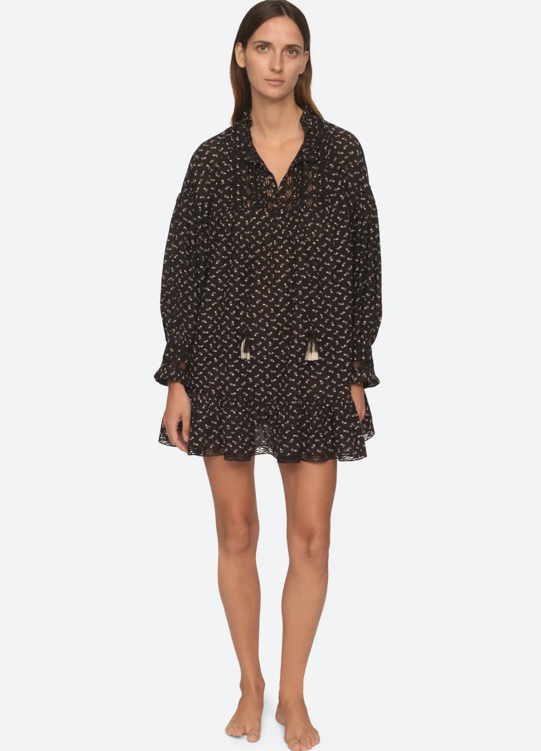 The Rosa embroidery pajama tunic dress features tassel ties and lace detailing.