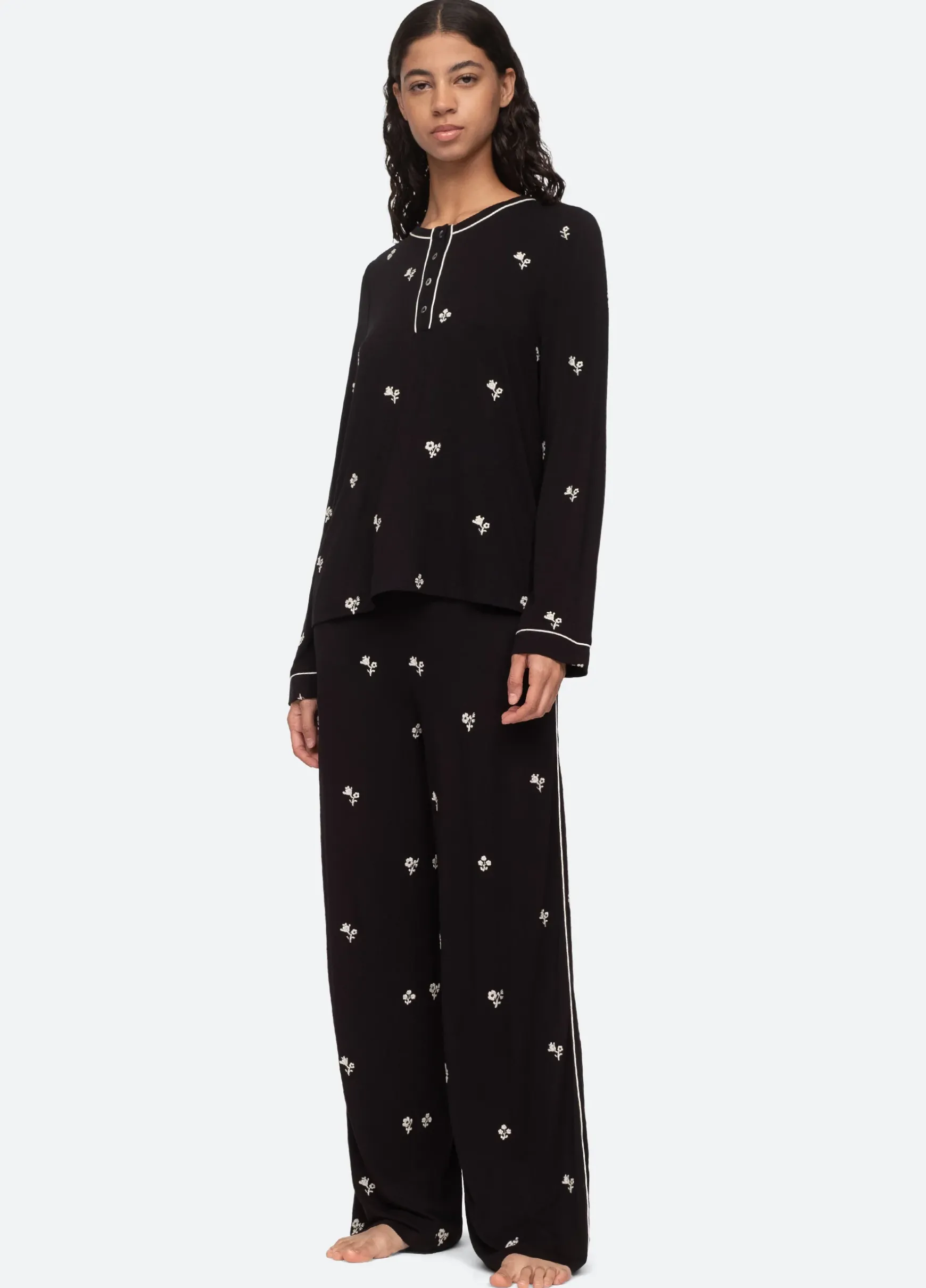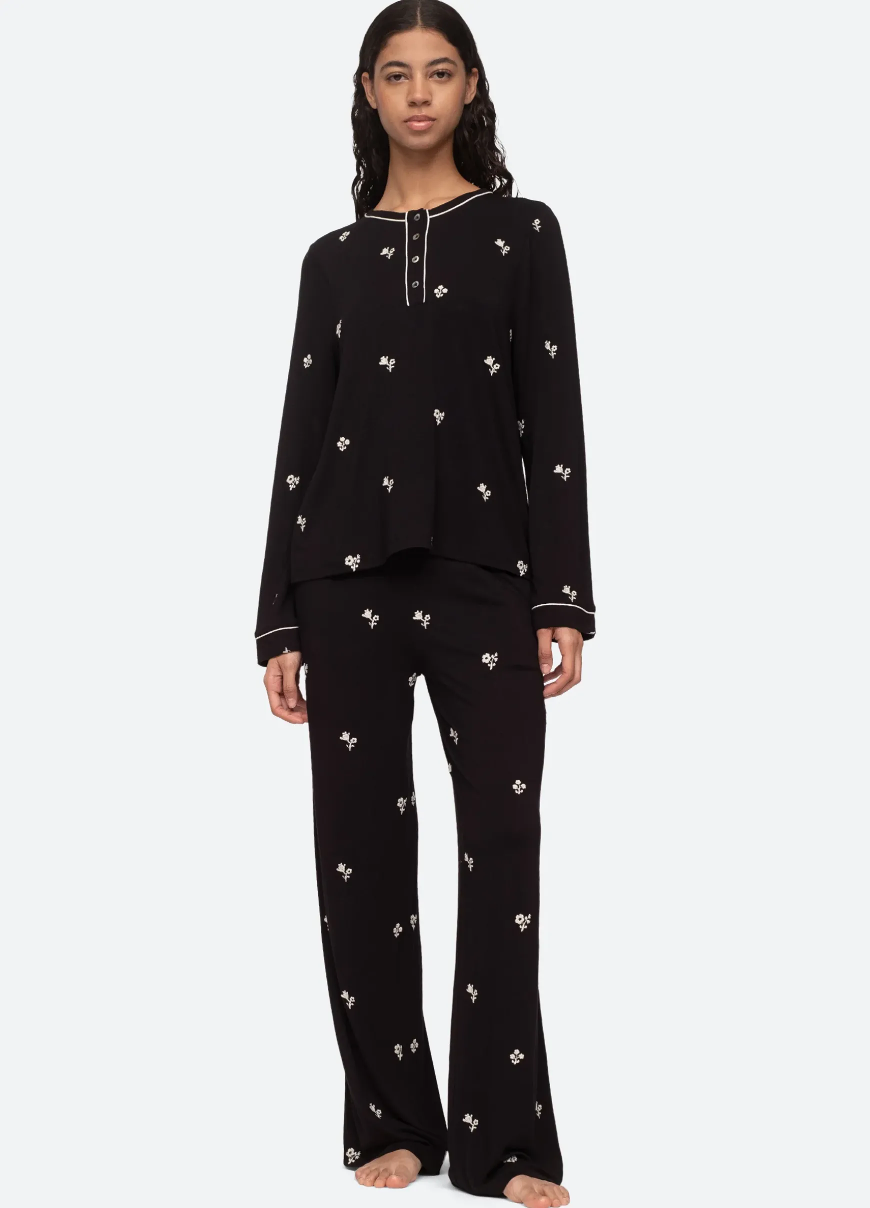 The Rubina embroidery long pajama set features floral embroidery and a round neckline.