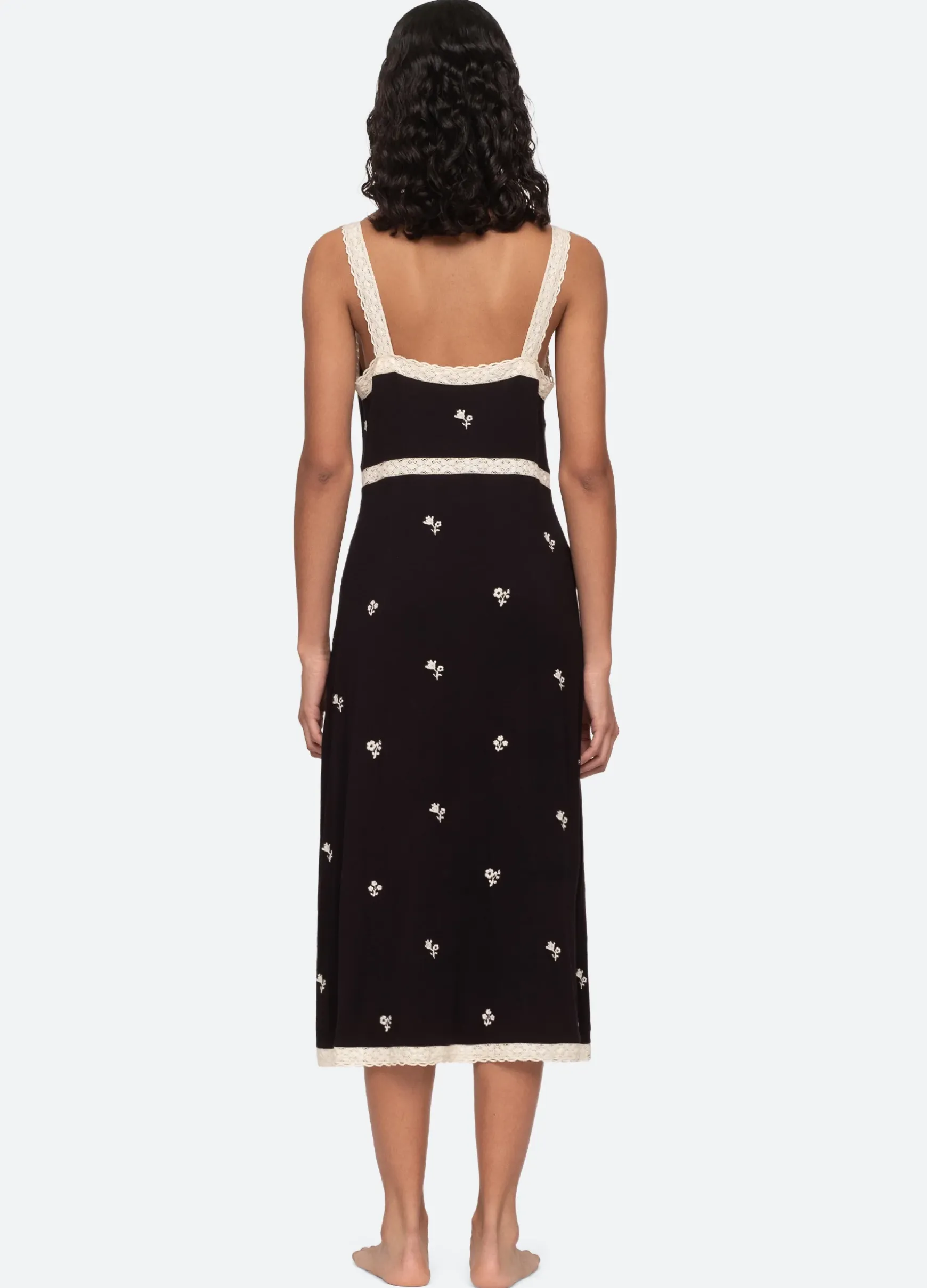 The Rubina embroidery pajama slip dress features floral embroidery and lace detailing.