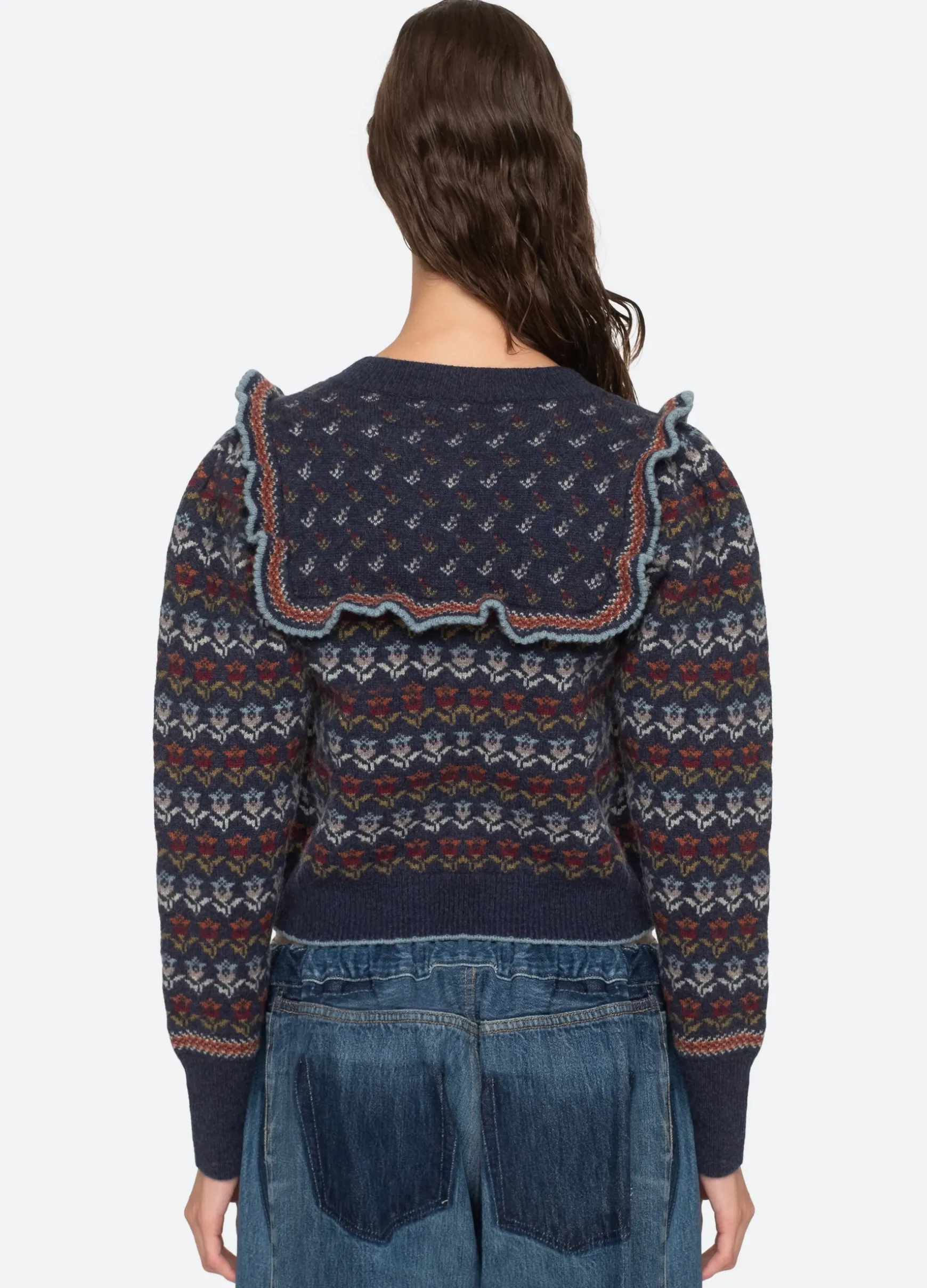 The Anna long sleeve cardigan features a ruffle bib and multi colored floral motif.