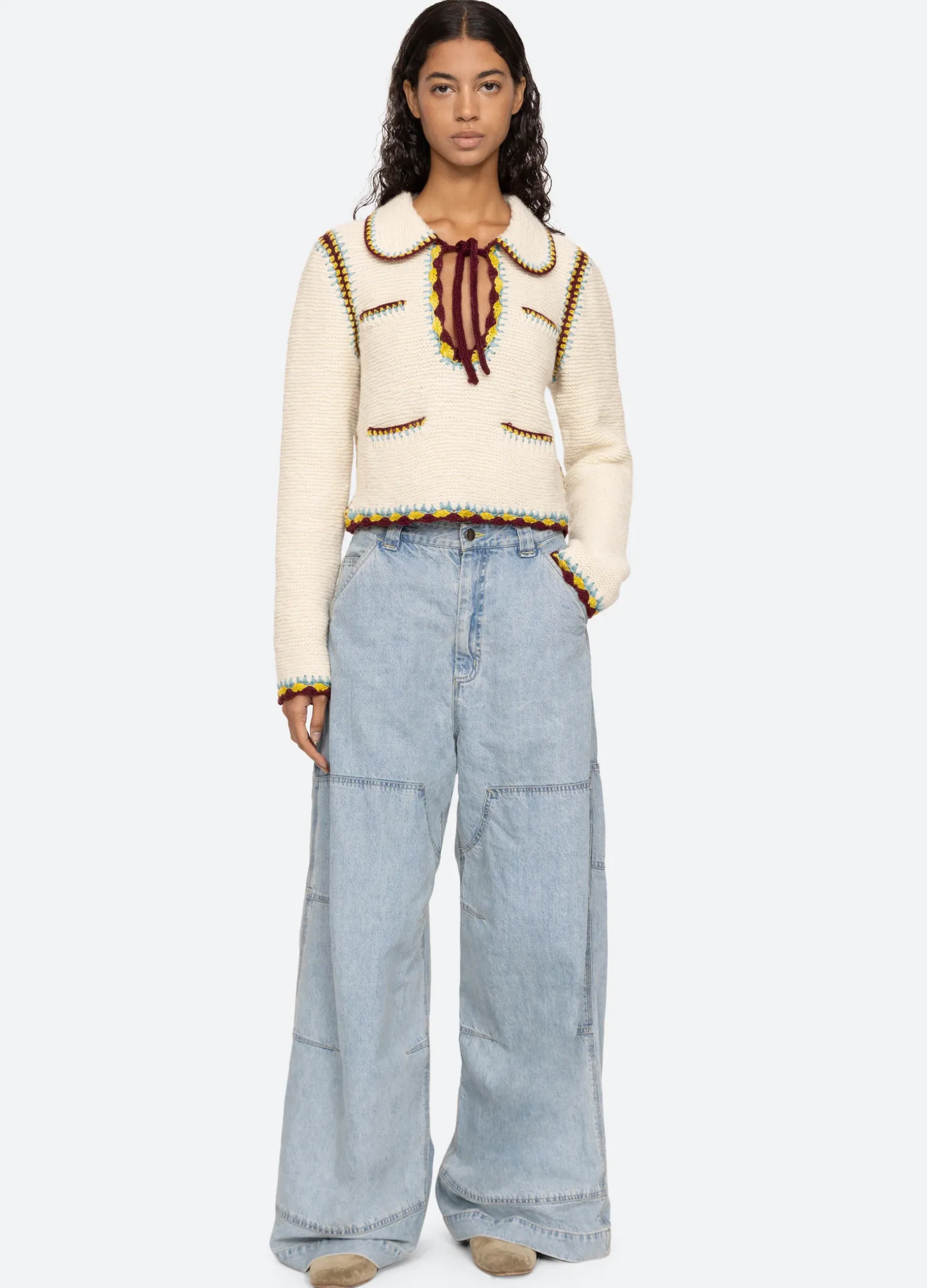The Evan sweater features contrast trim detailing and self tie at neckline.