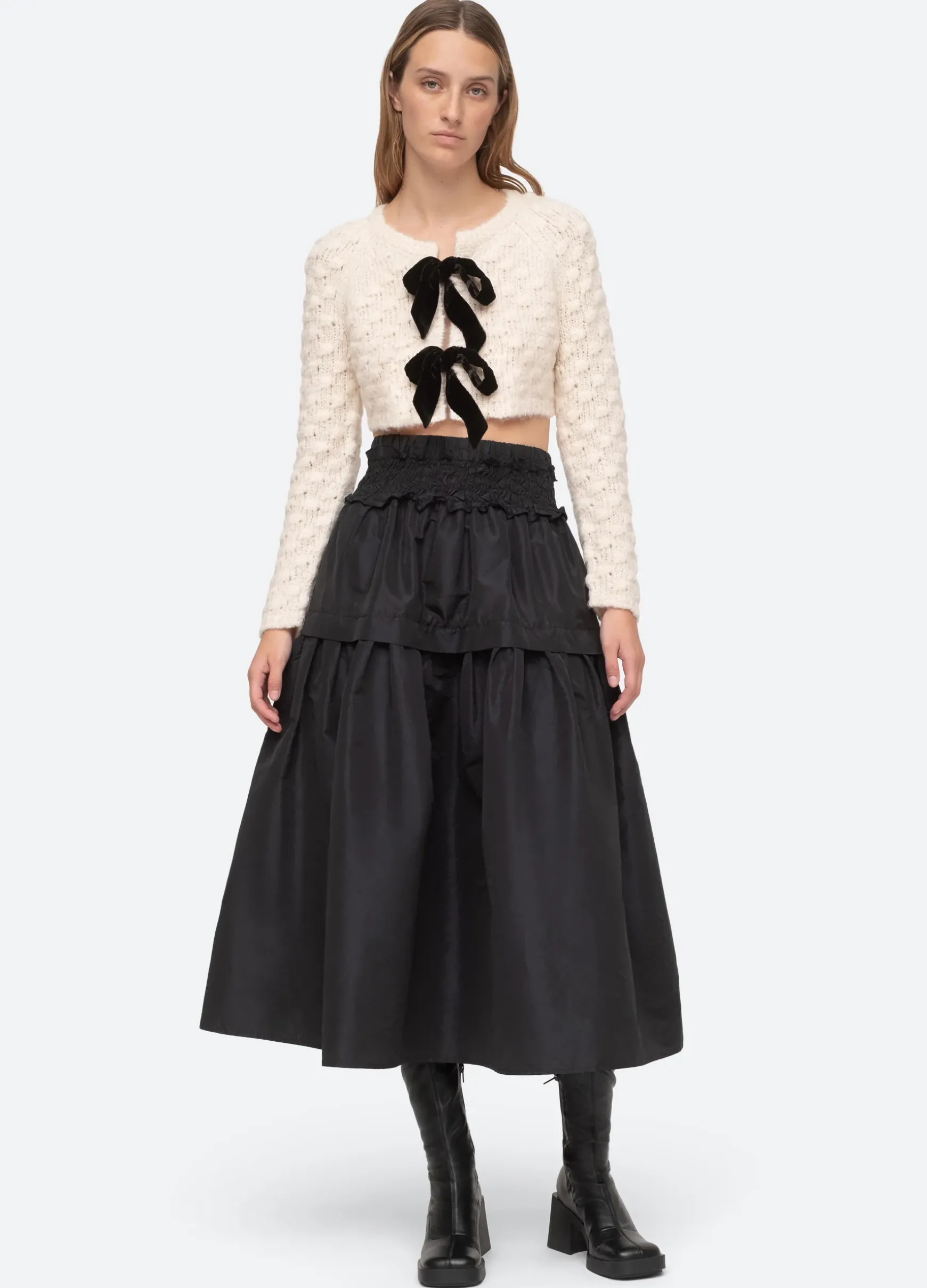 The Teresa bow tie cropped cardigan with long sleeves features velvet bow ties.
