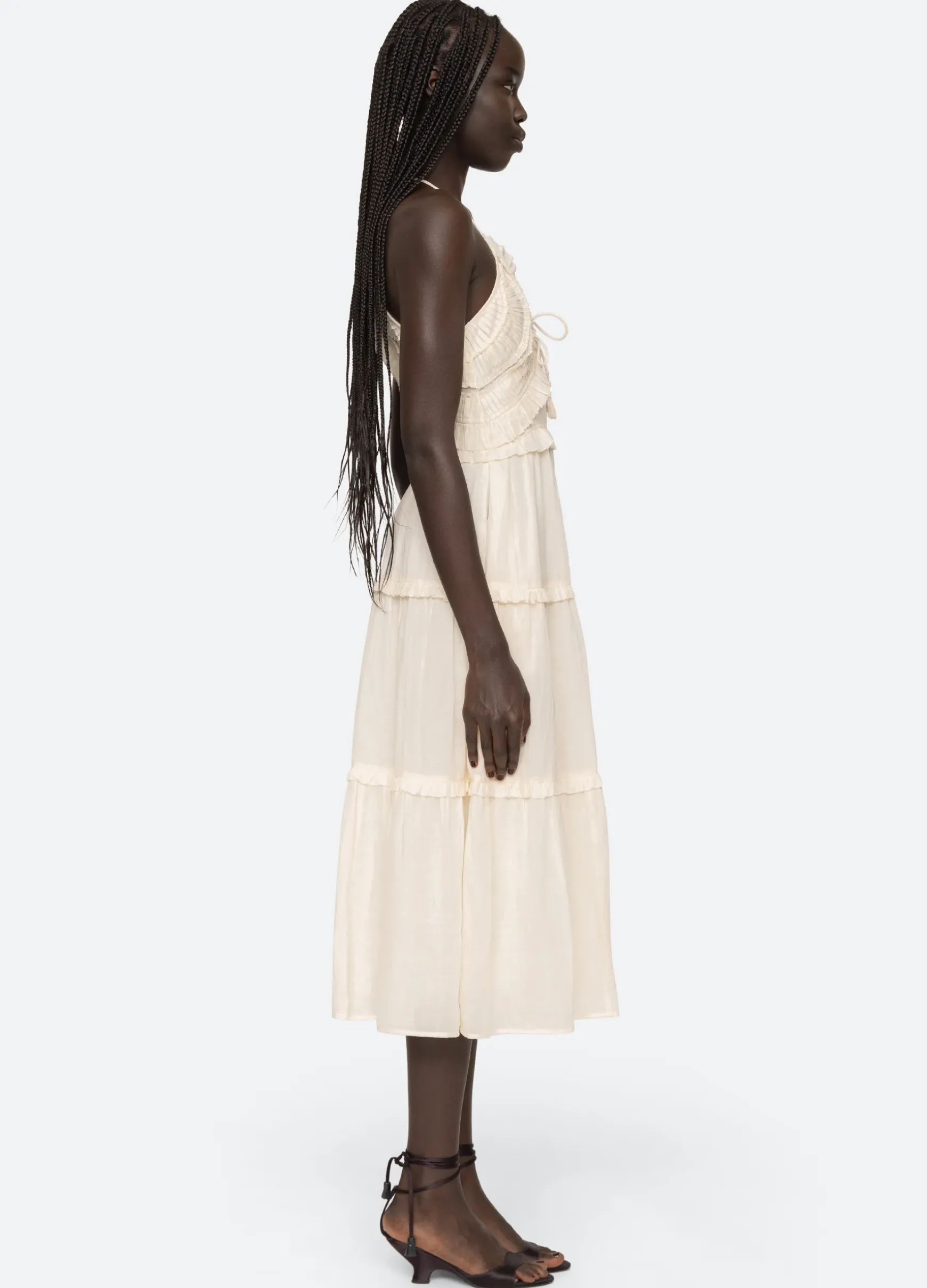 The Cole smocked dress features ruffle and pintucked detailing, a halter neck tie and center cutout.
