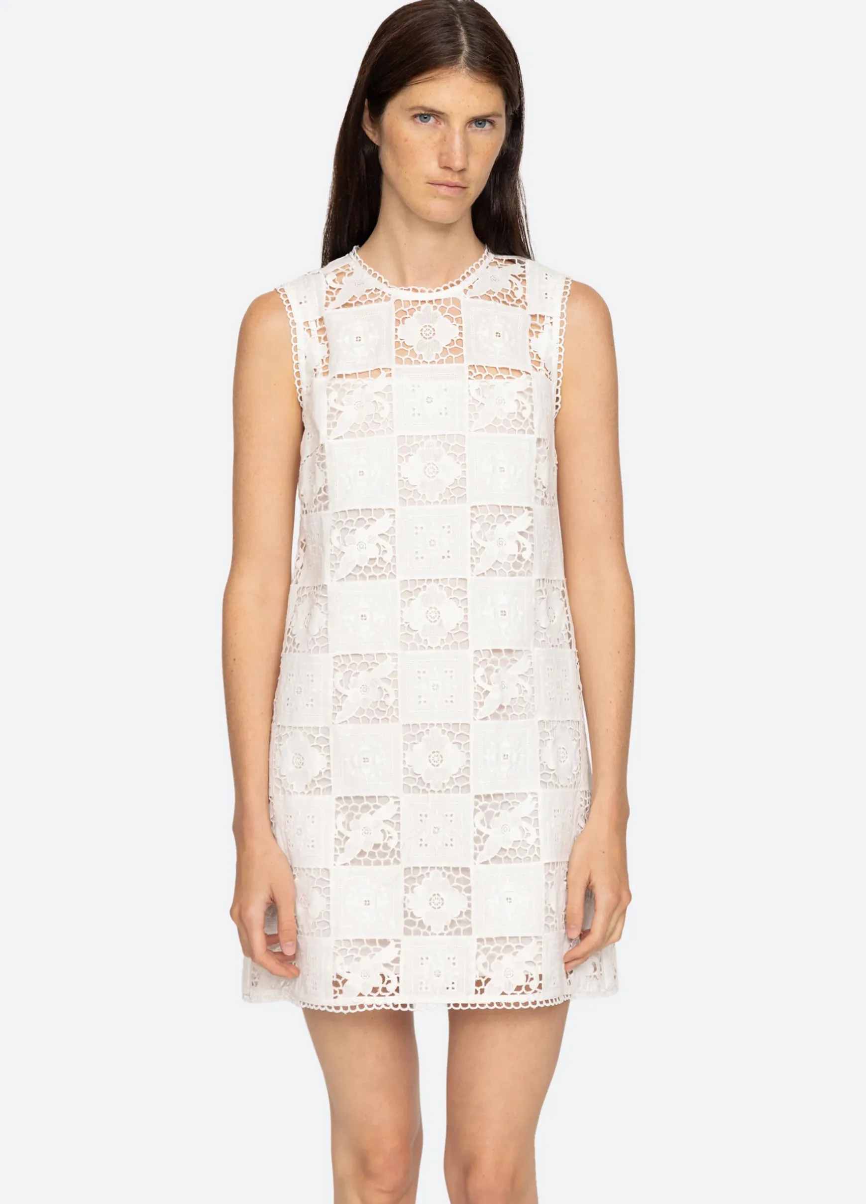 The Melia embroidered tank dress features a floral embroidered patchwork design and mini silhouette.