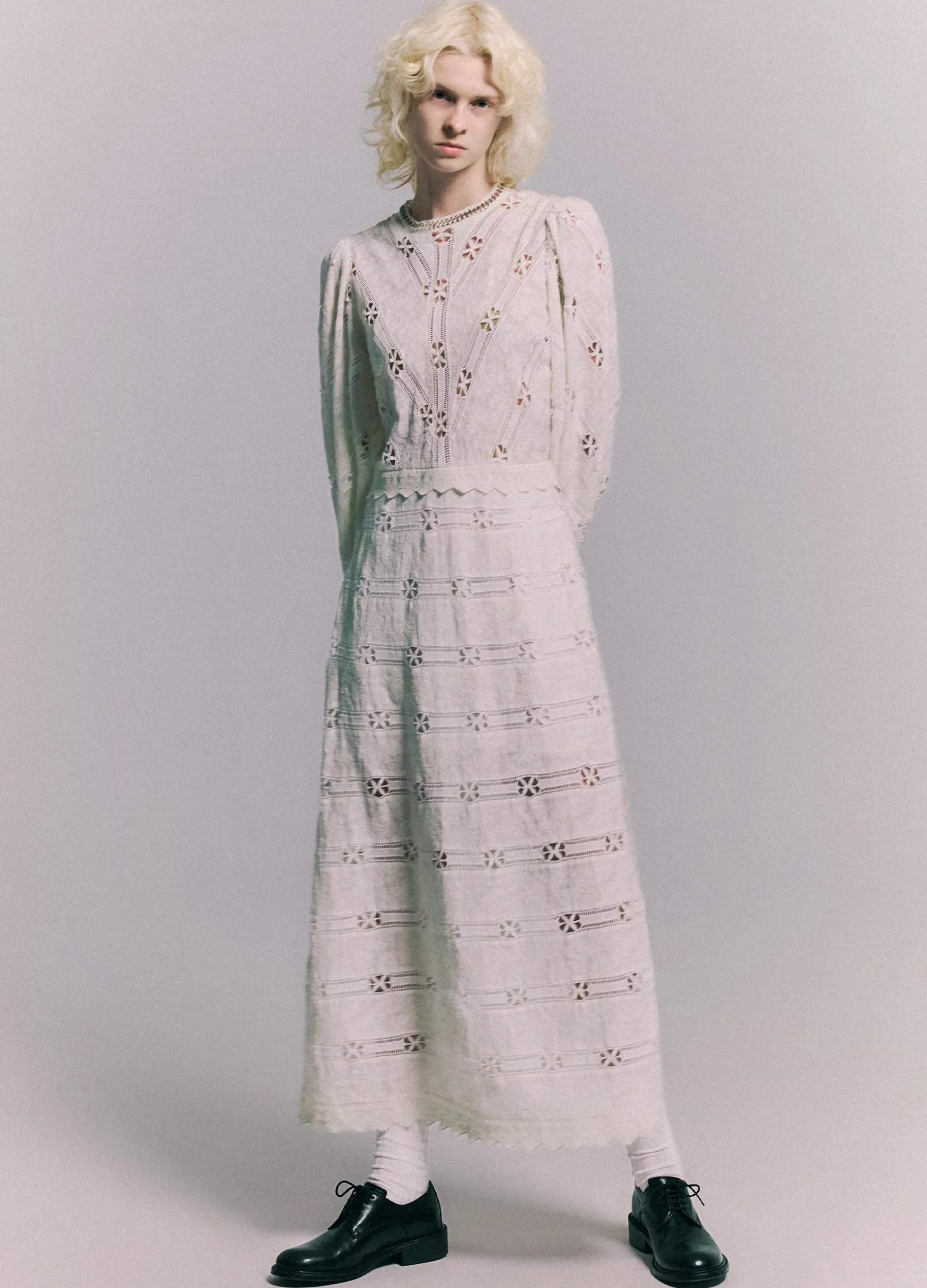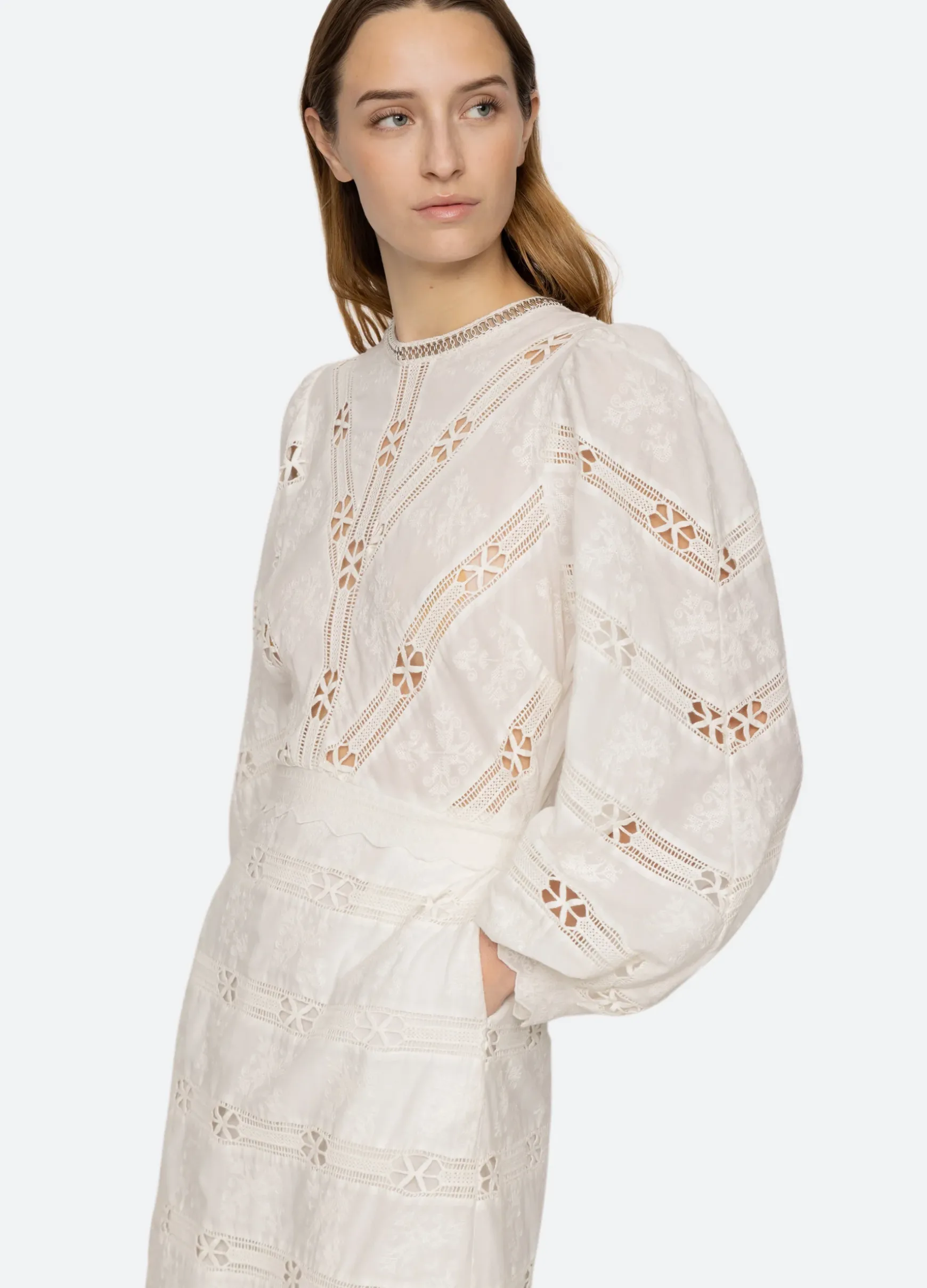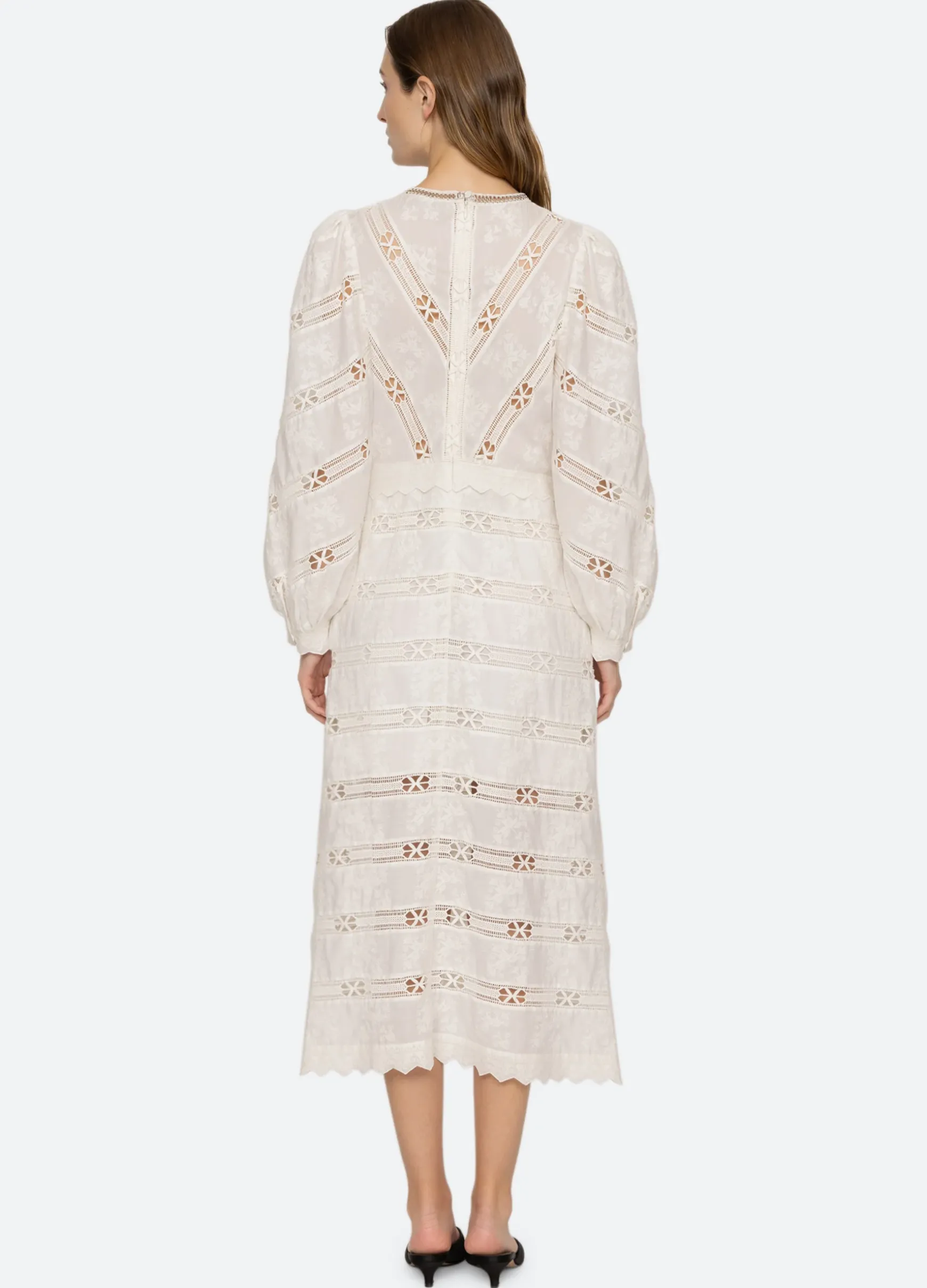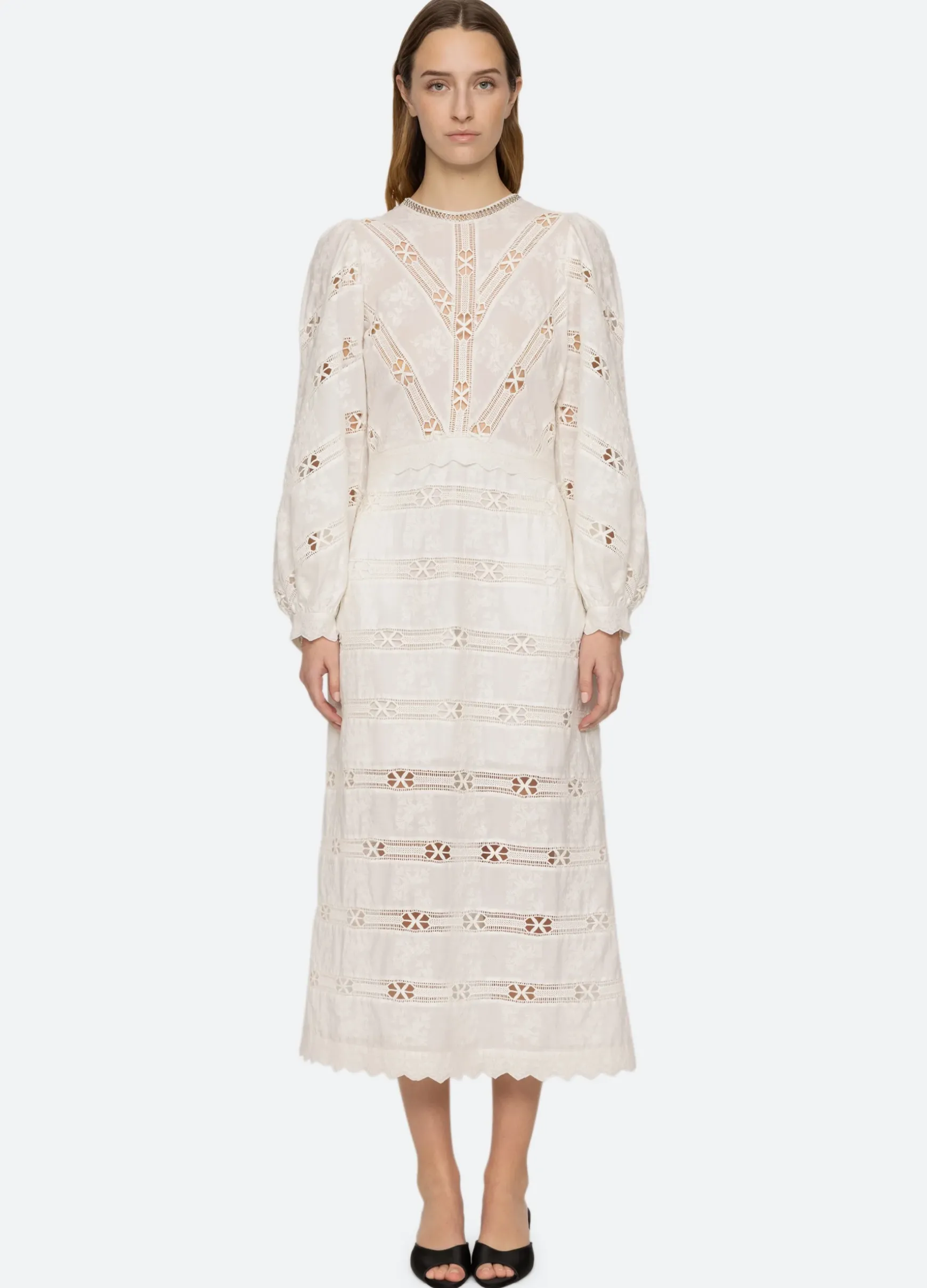 The Sharika embroidered lace dress features long puff sleeves, scalloped trim and crocheted metal chain accents.