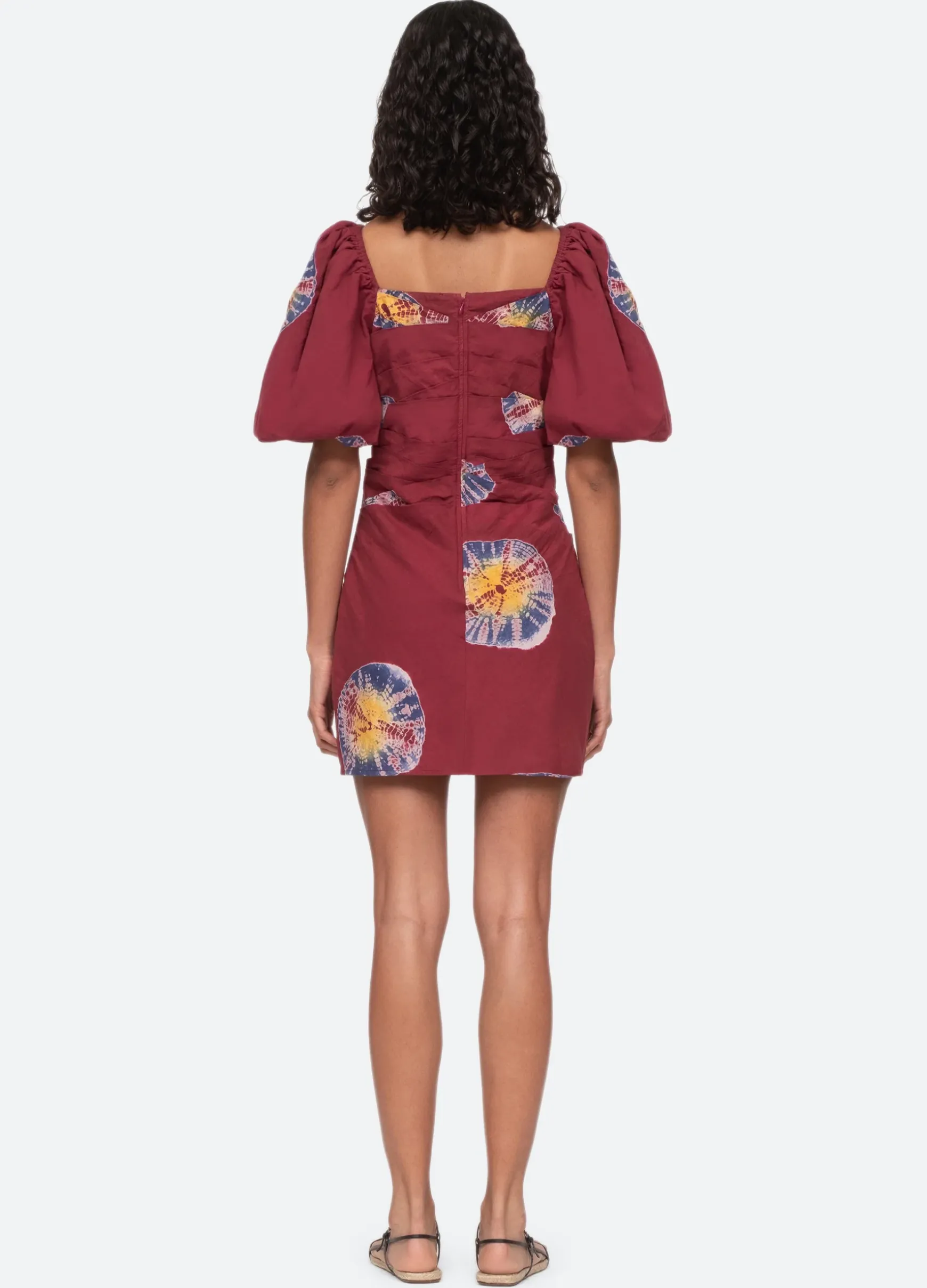 The Lourdes tie dye dress features short puff sleeves, square neckline and draped detailing.