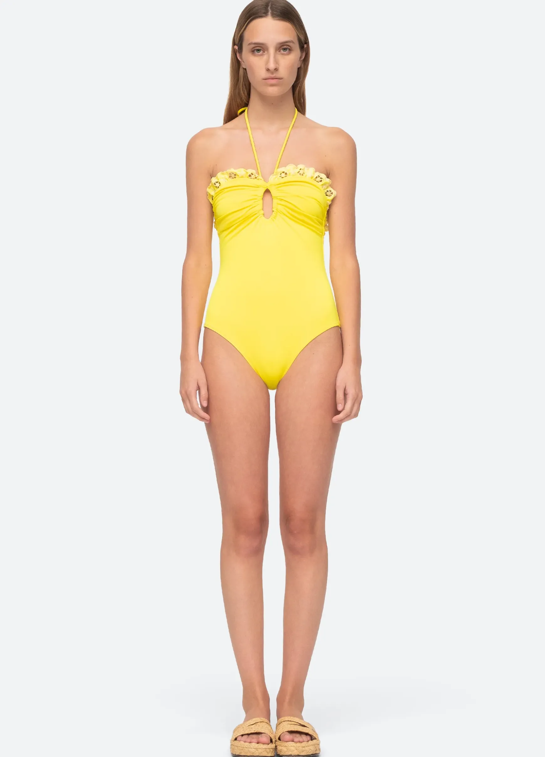 The Arabella one piece swimsuit features a center cutout, ruffle embroidered detailing and halter neckline.