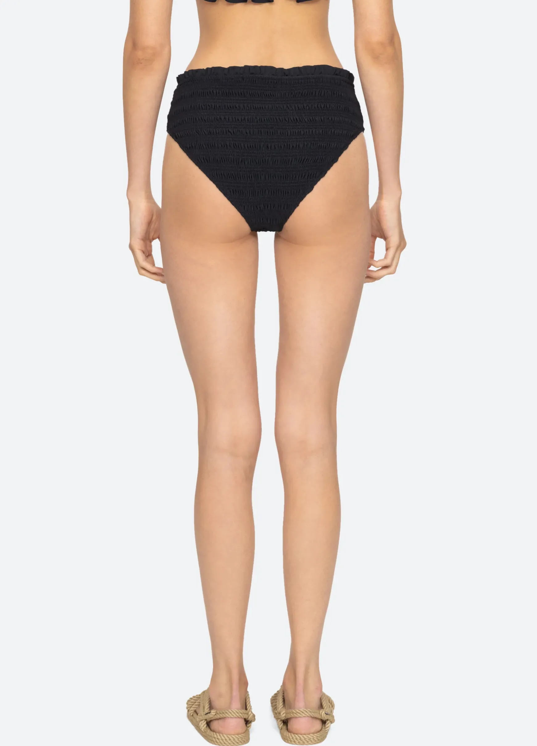 The Brice solid smocked bikini bottom features ruffle detailing.
