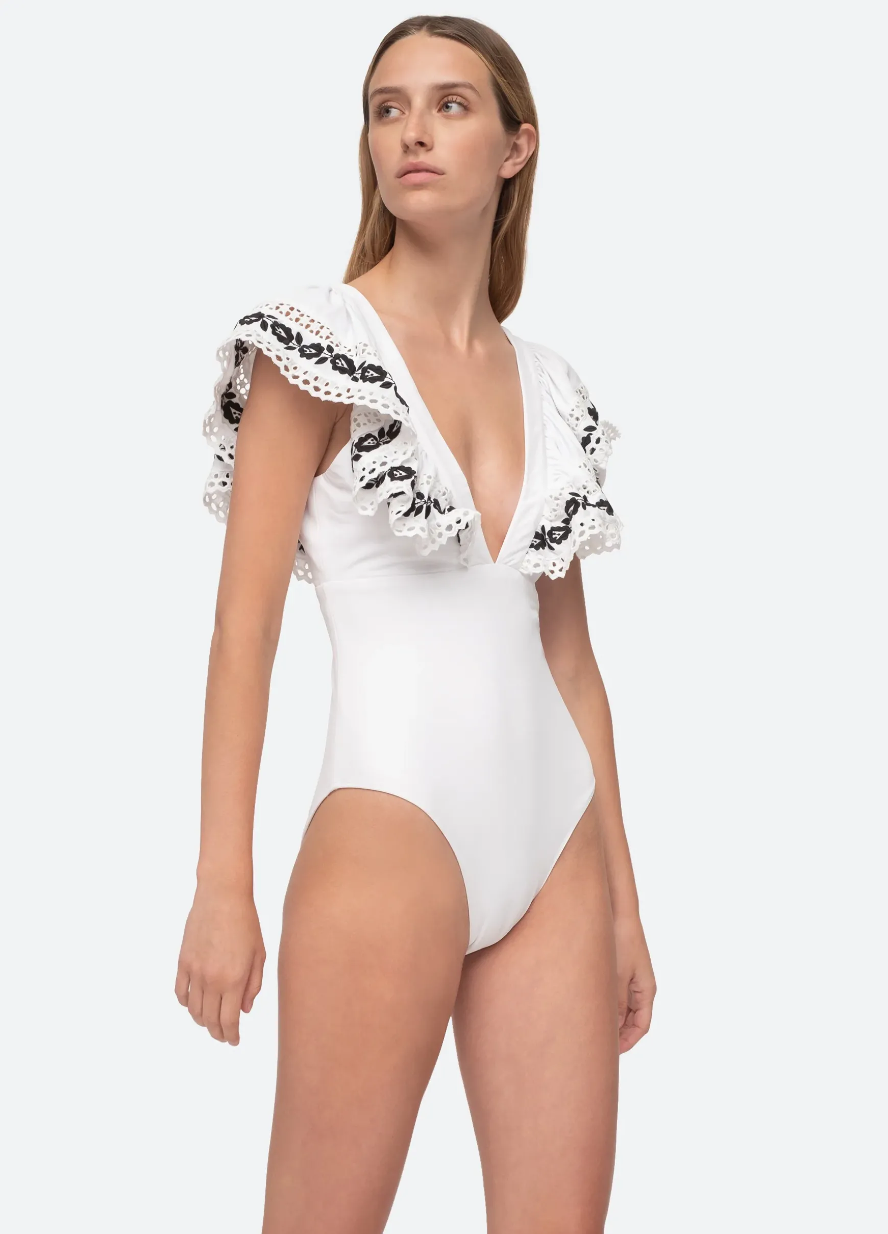 The Kayta one piece with ruffles swimsuit features a plunging neckline traced with ruffle and floral embroidery detailing.