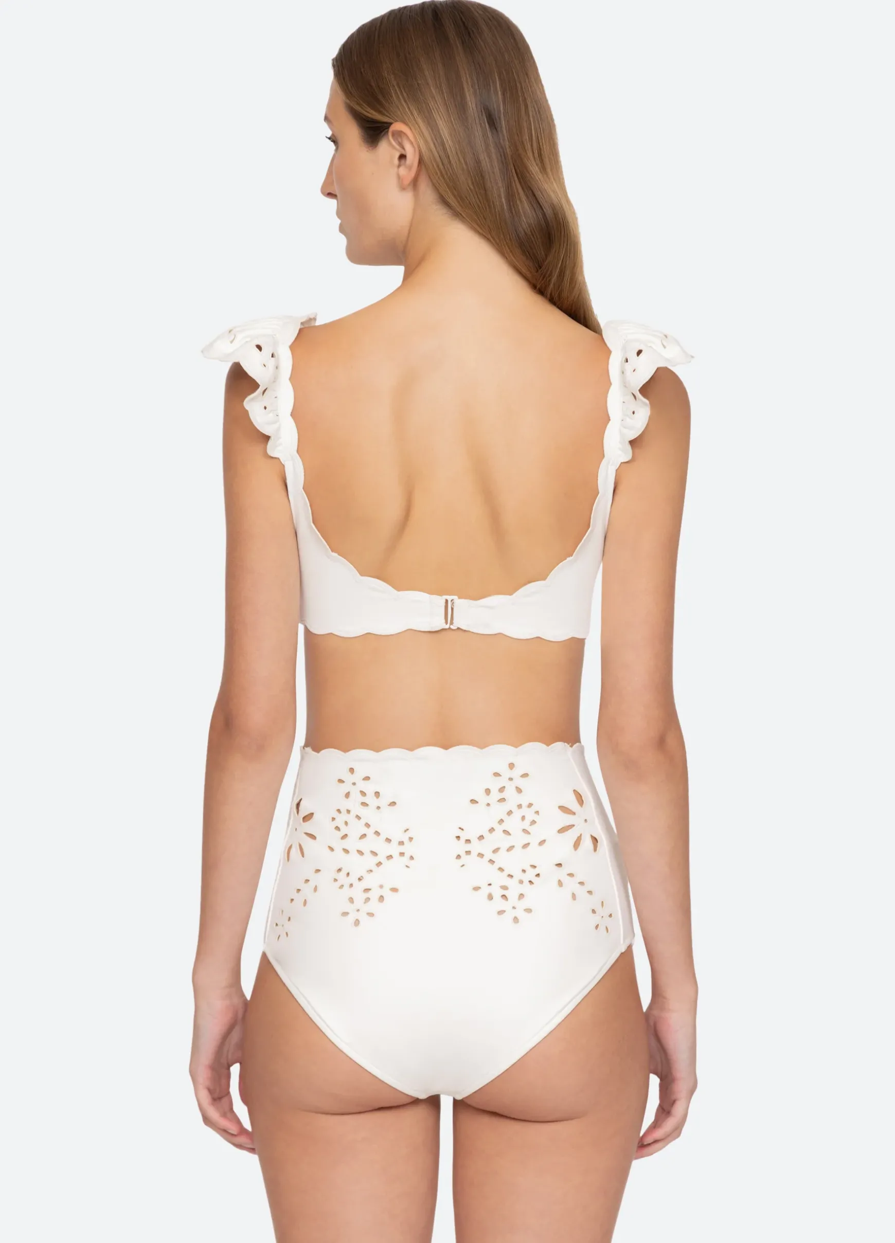 The Liat eyelet bikini top features flutter sleeves and floral embroidered detailing.