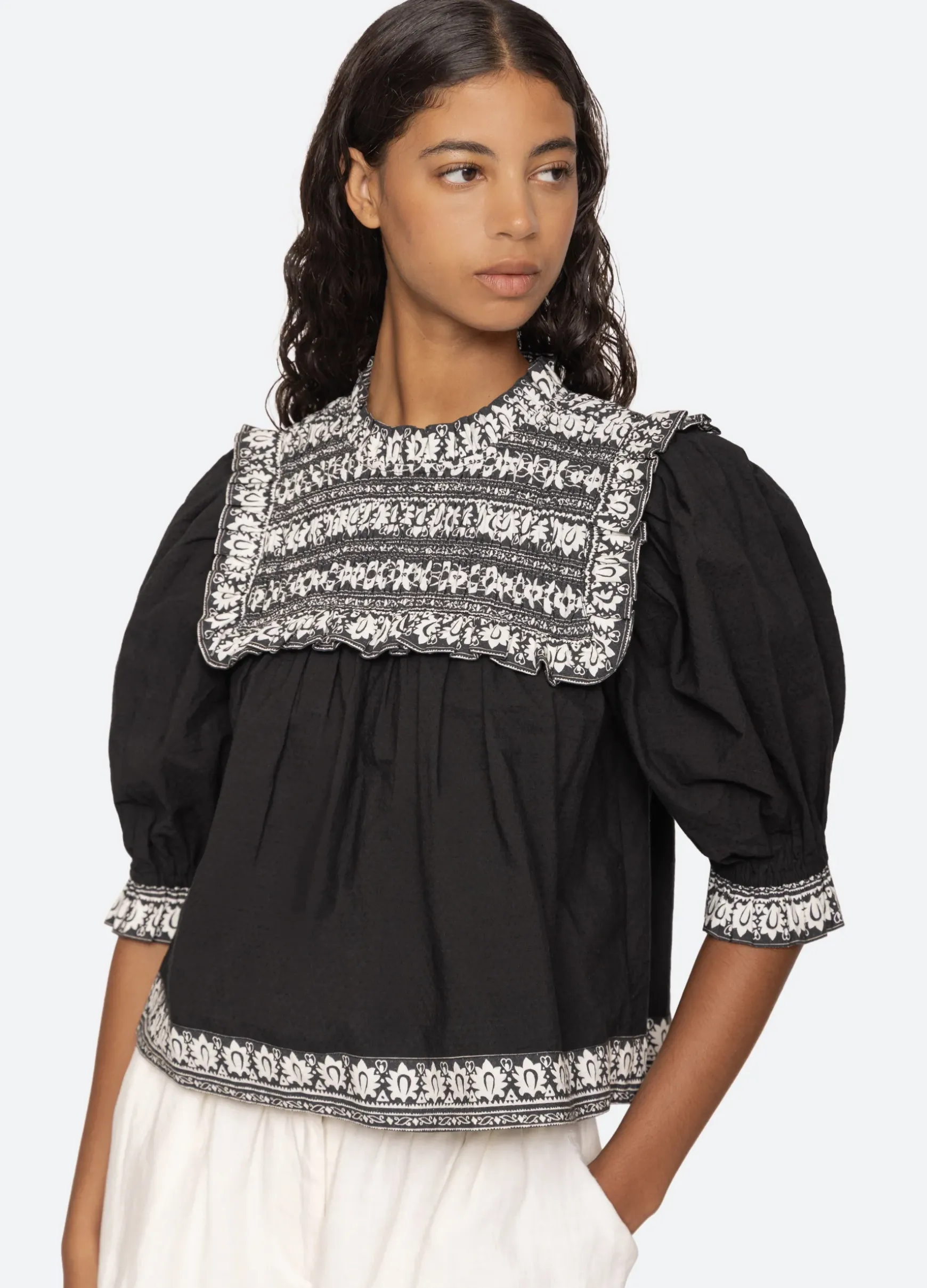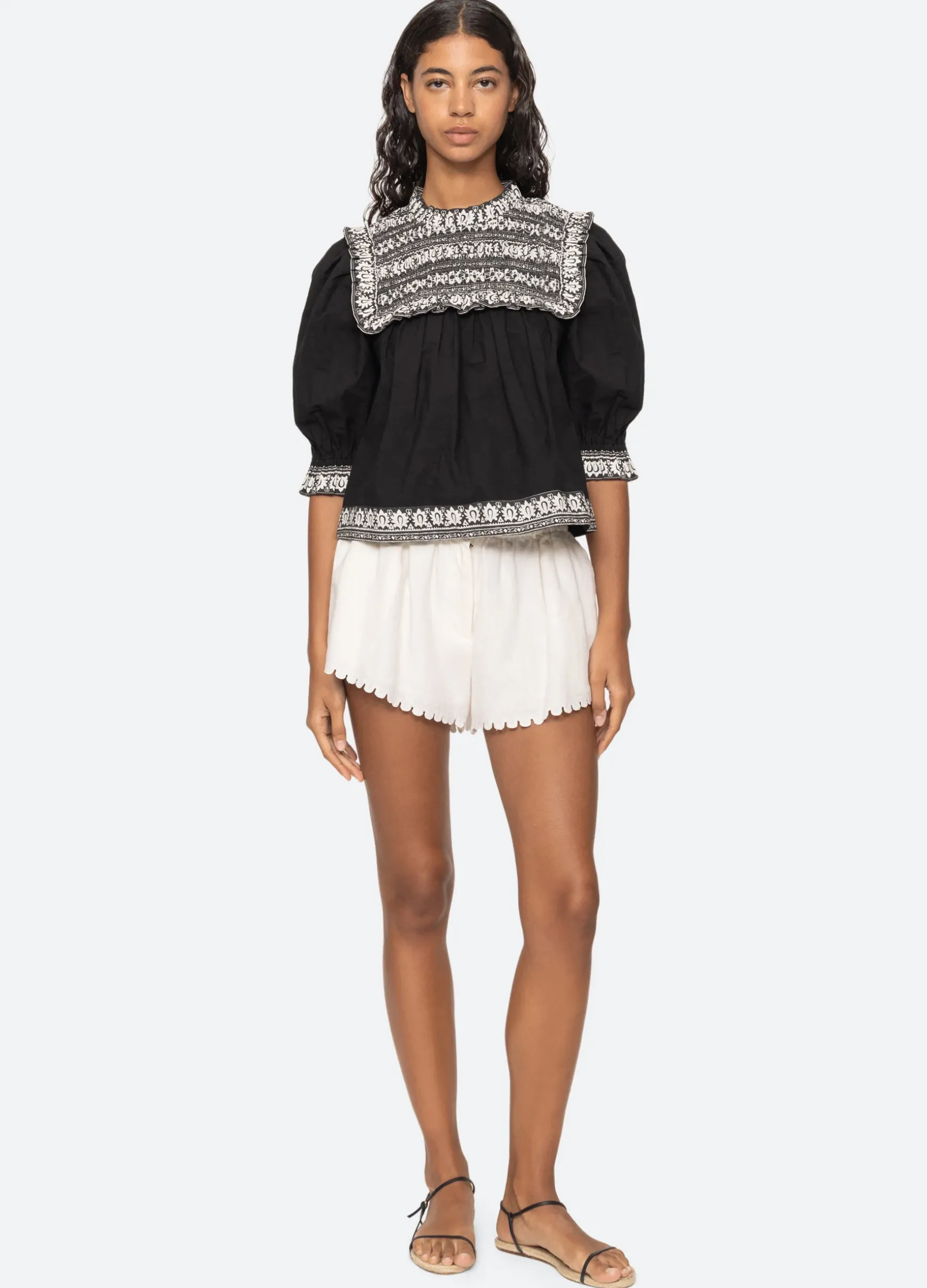 The Amina border print top features puff sleeves, smocked detailing and ruffle trim. Designed for an easy, relaxed fit.