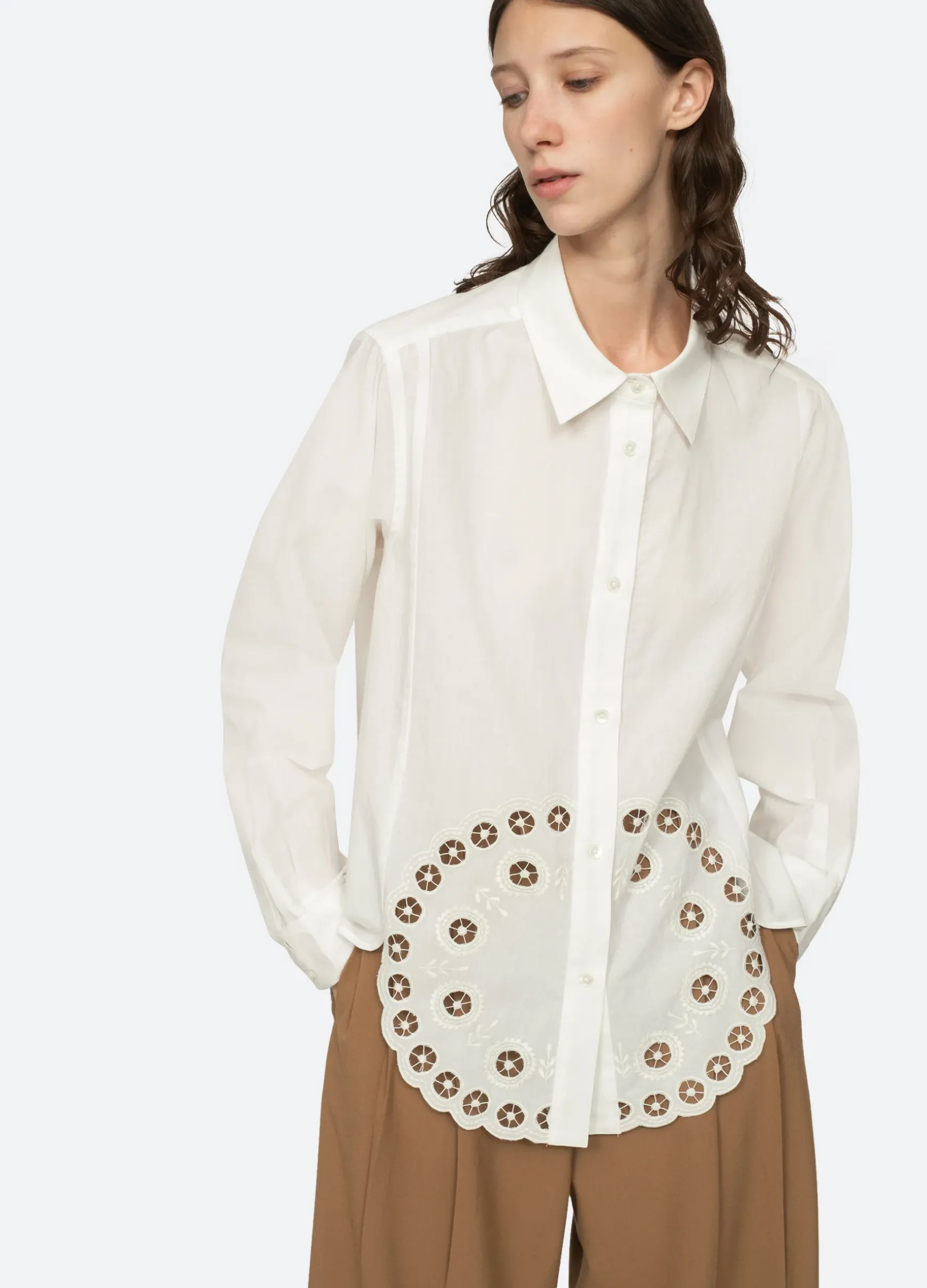 The Arabella eyelet embroidered button down top features eyelet embroidery and high low hem.