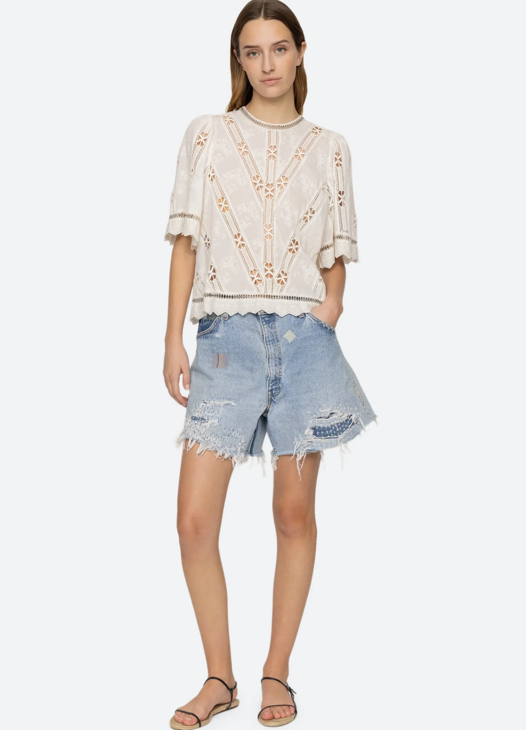The Sharika embroidered lace top features scalloped trim and crocheted metal chain accents. Designed for an easy, relaxed fit.