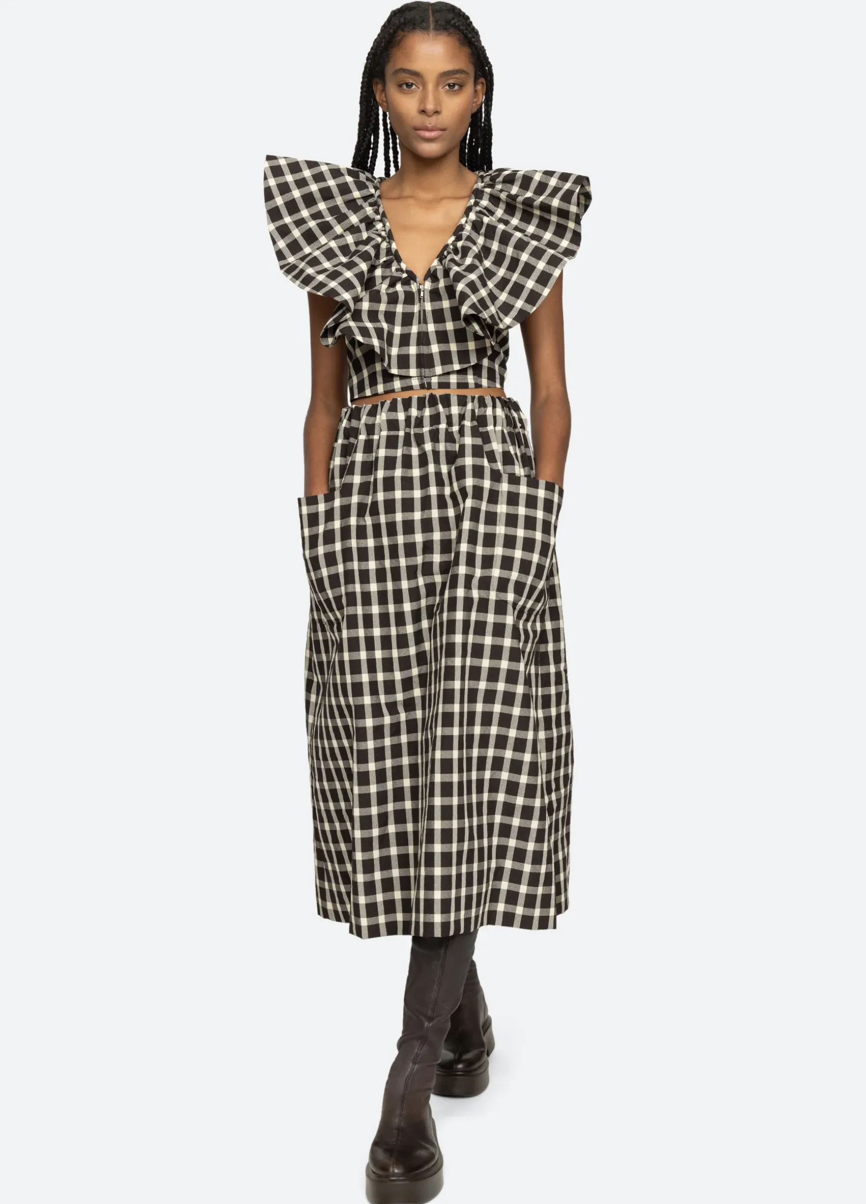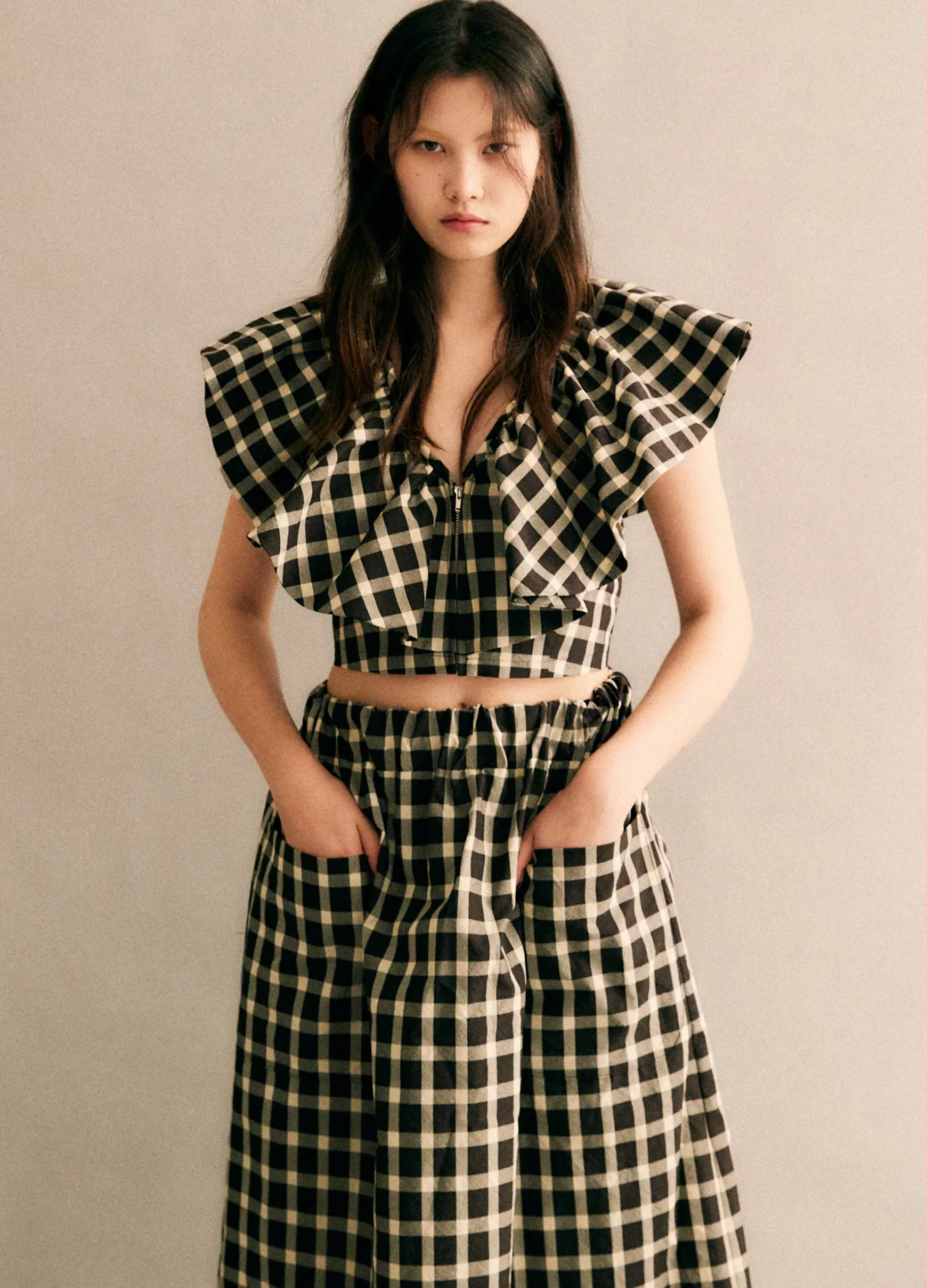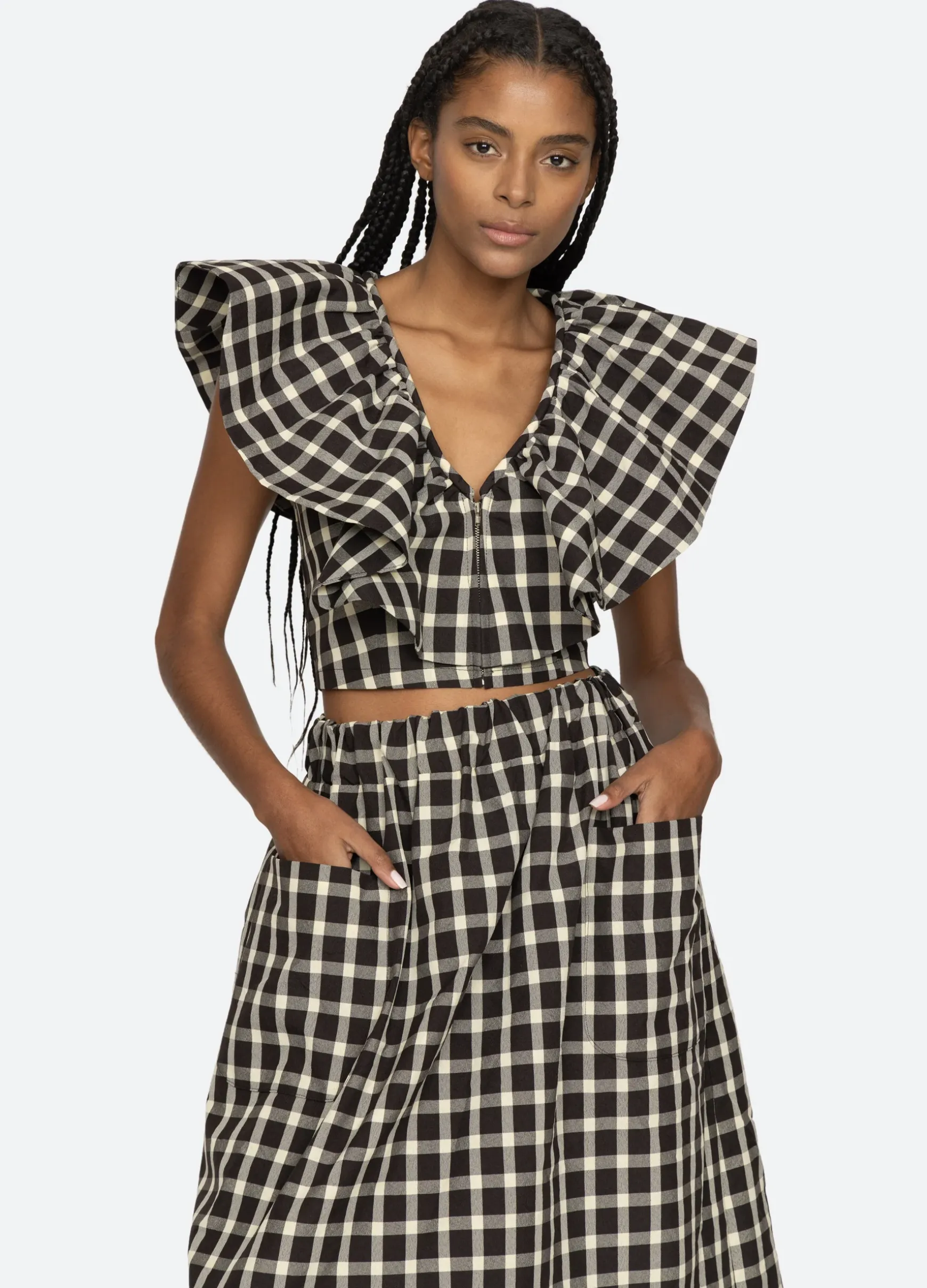The Valeria check print ruffle tank features a cropped silhouette and oversized ruffle detailing.